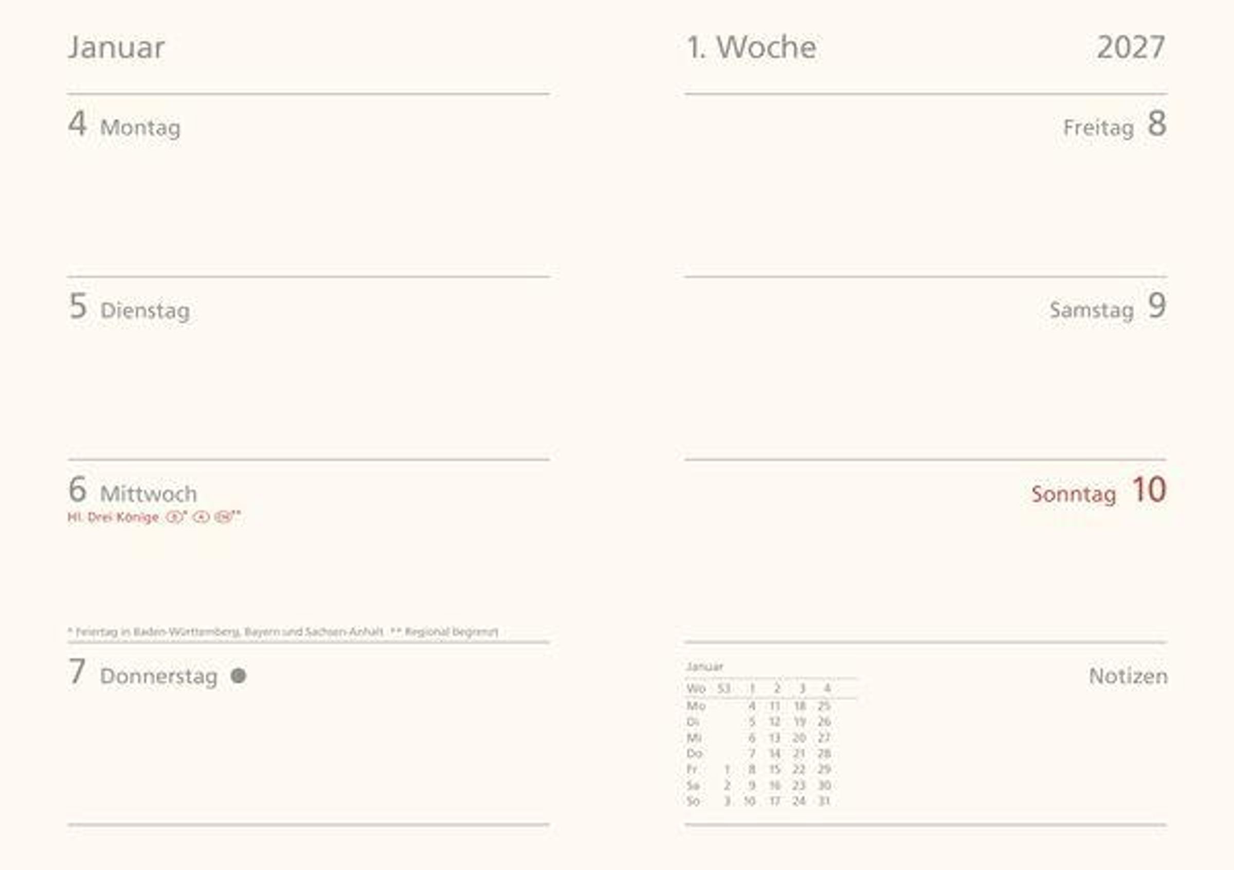 - Praktische Wochenübersicht; Jede Kalenderwoche übersichtlich auf einer Doppelseite