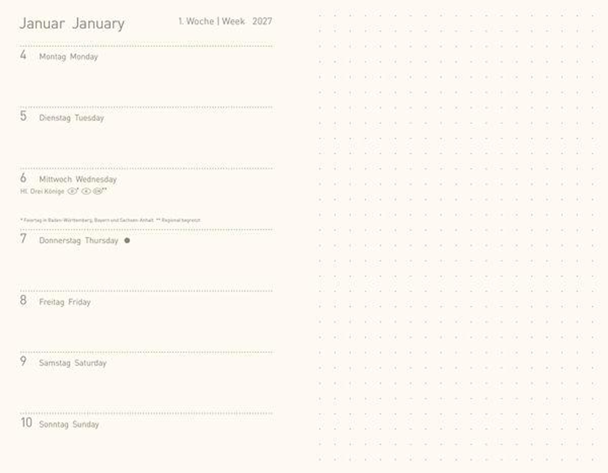 Taschenkalender im Format: 9 x 14 cm, 144 Seiten, umweltfreundliches FSC Papier Jede Doppelseite des 12 Monats-Kalendariums zeigt die Wochenübersicht sowie eine Seite für Notizen Kalendarium auf Deutsch und Englisch; Feiertagen für Deutschland, Österreich und Schweiz Geprägter und mit Kaltfolie veredelter Umschlag Stifthalter und Lesebändchen sowie praktische Zetteltasche; Anzeige der Mondphasen