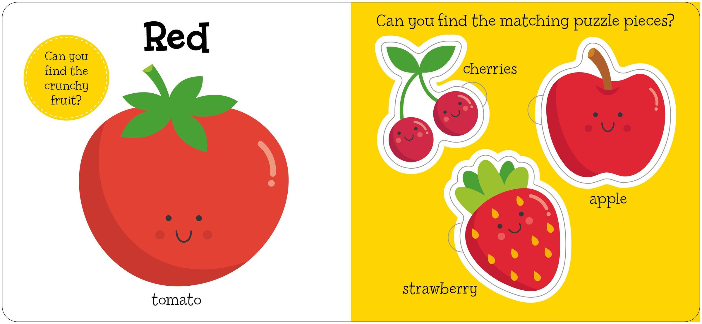 Preschoolers can learn about healthy fruits and vegetables as they go through the book and find the press-out pieces. Each of the 12 play pieces matches an image on the page and fits securely into the die-cut spaces, but can also be used separately as flash cards. This book encourages fine motor skills and problem-solving, as well as teaching core vocabulary.