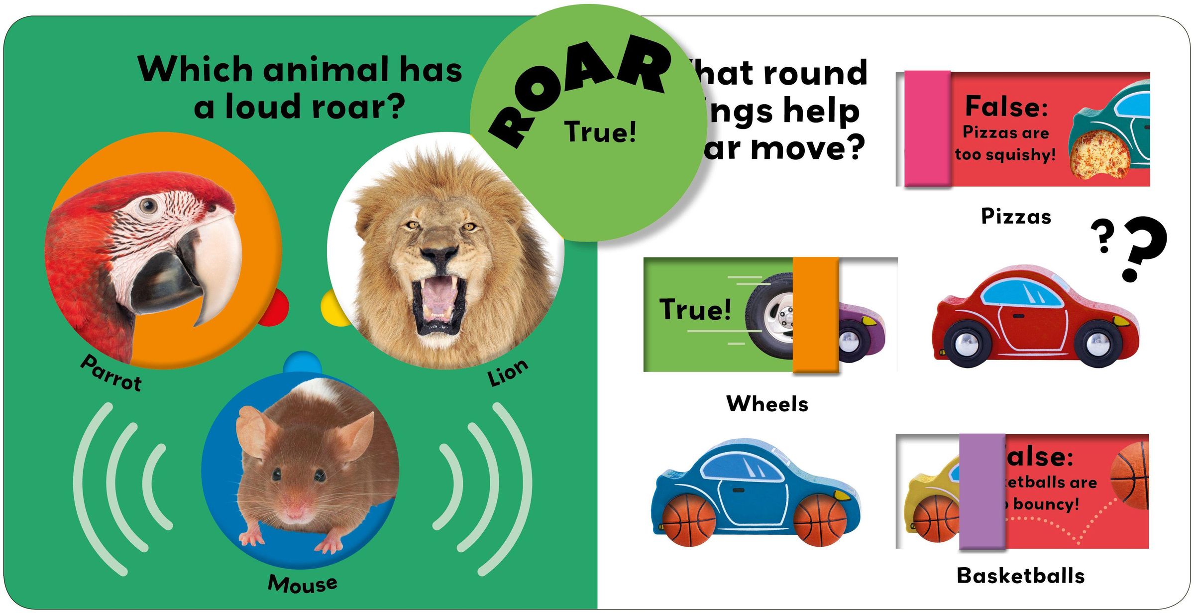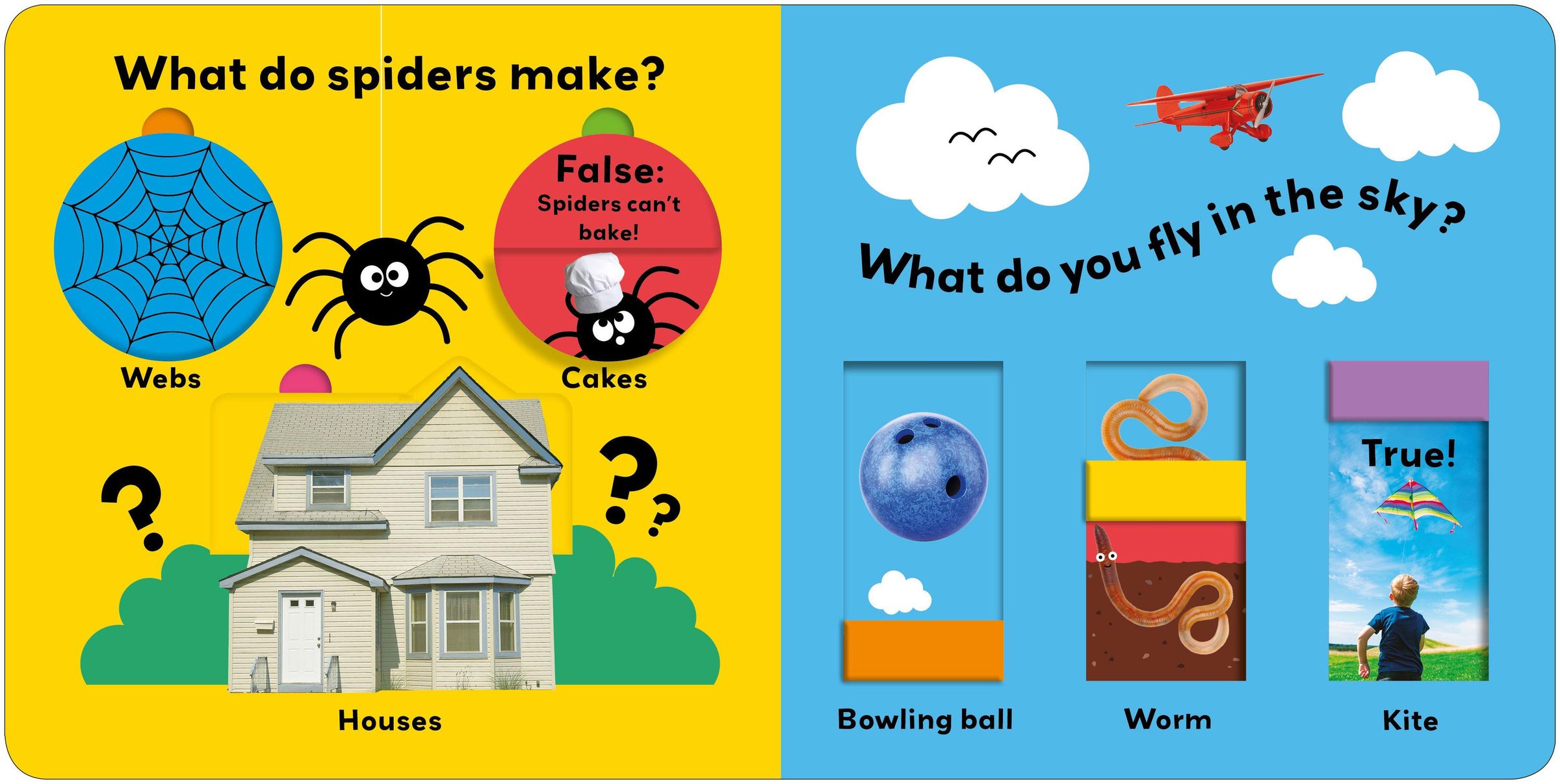 Each page features a simple question, with two fantastically silly false answers and one true answer, all hidden behind flaps and sliders that little ones can open and move themselves.