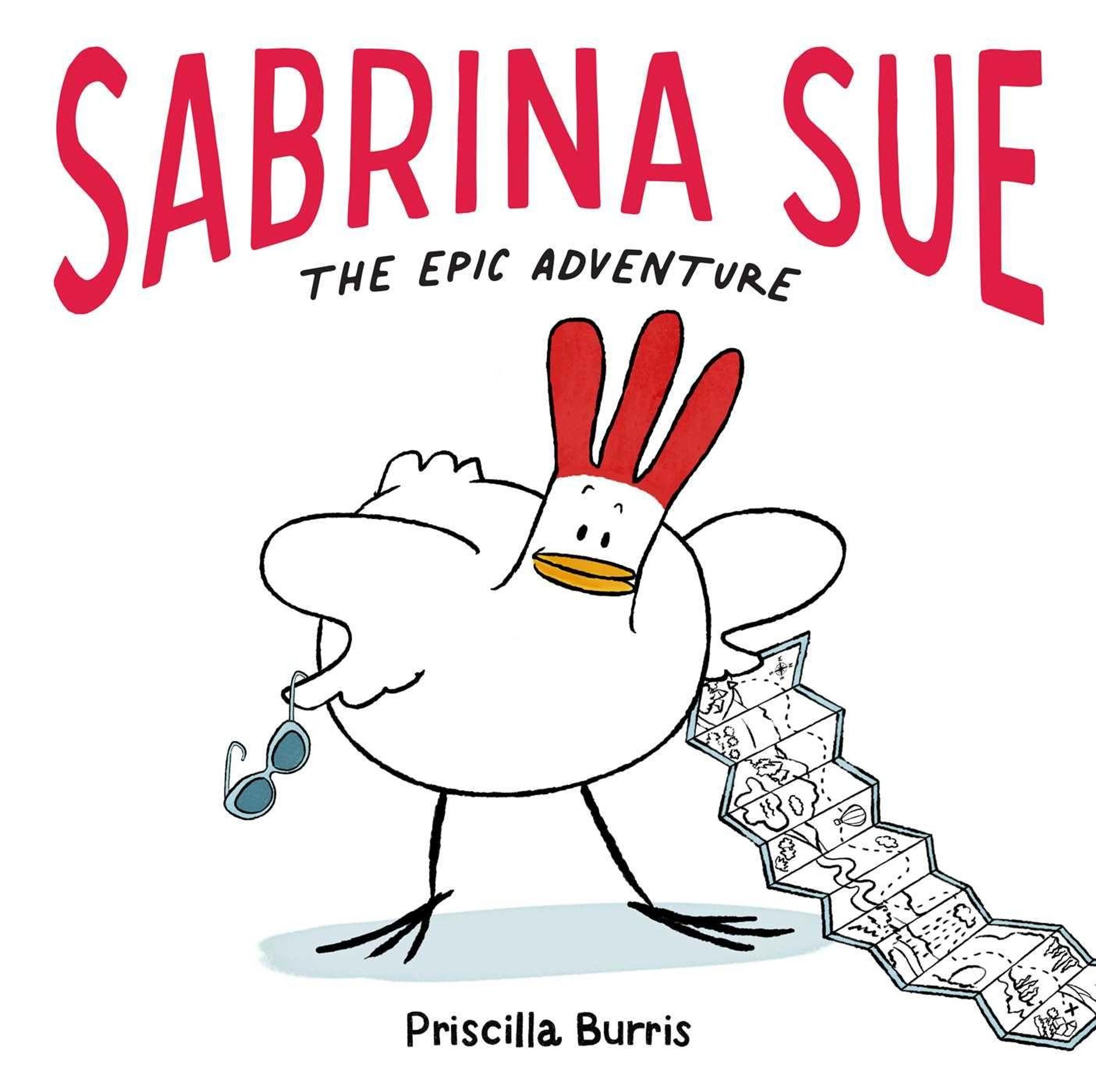 „SABRINA SUE: THE EPIC ADVENTURE“. Eine Illustration einer Henne mit Sonnenbrille und einer langen Karte. Darunter: Priscilla Burris., Buch