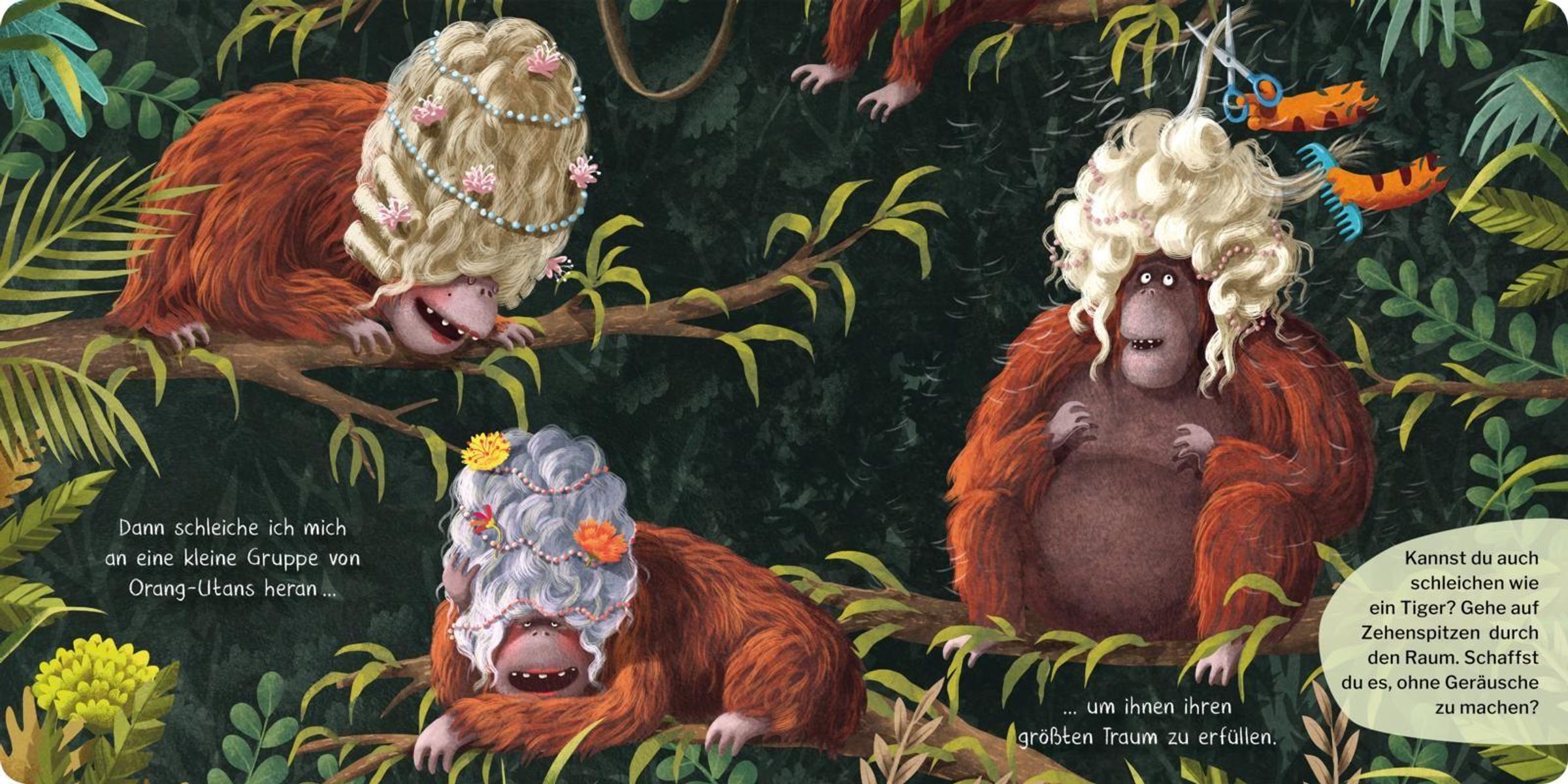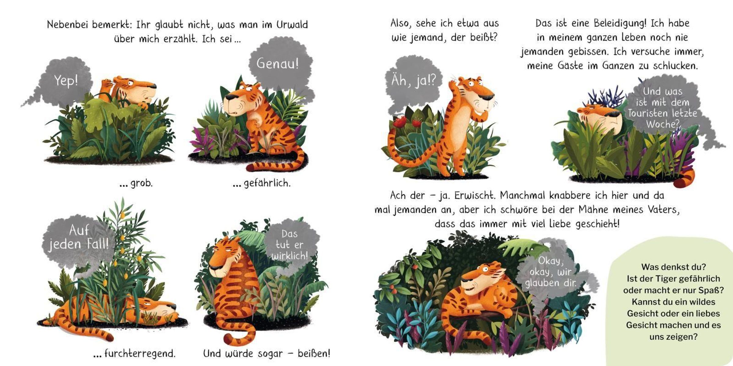 Wer schleicht nachts durch den Dschungel? Achtung, ein achtsamer Tiger! Im Urwald erzählt man sich, der Tiger sei wild und gefährlich. Doch halt, das stimmt doch gar nicht! Nachts zeigt der Tiger nämlich sein wahres Ich: Mit seinen scharfen Krallen schlitzt er das Obst auf - damit der kleine Elefant seinen Fruchtsalat bekommt. Danach schnappt er sich die Papageieneier - um sie behutsam auszubrüten. Und was hat der Tiger mit der Schlange vor?