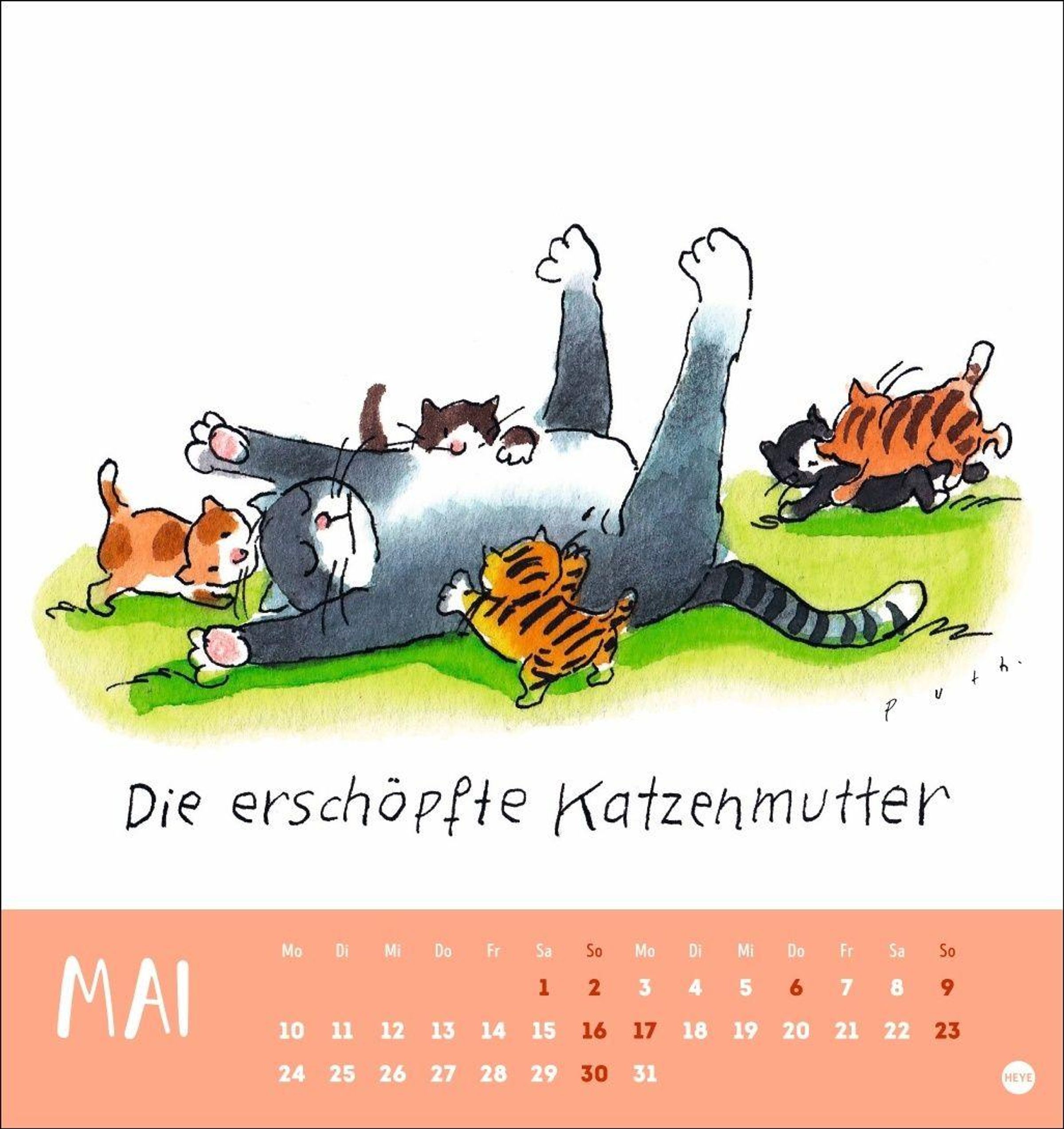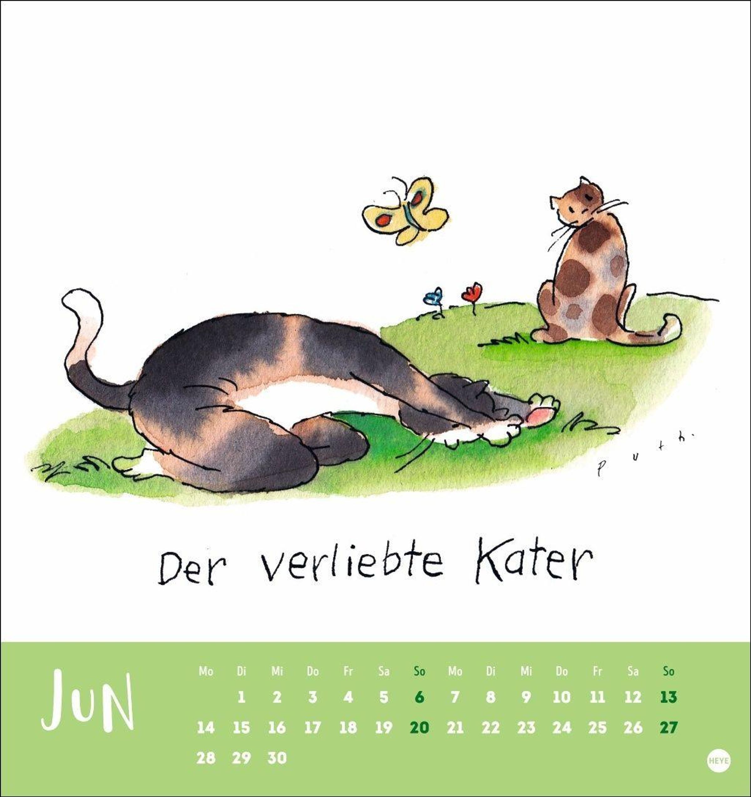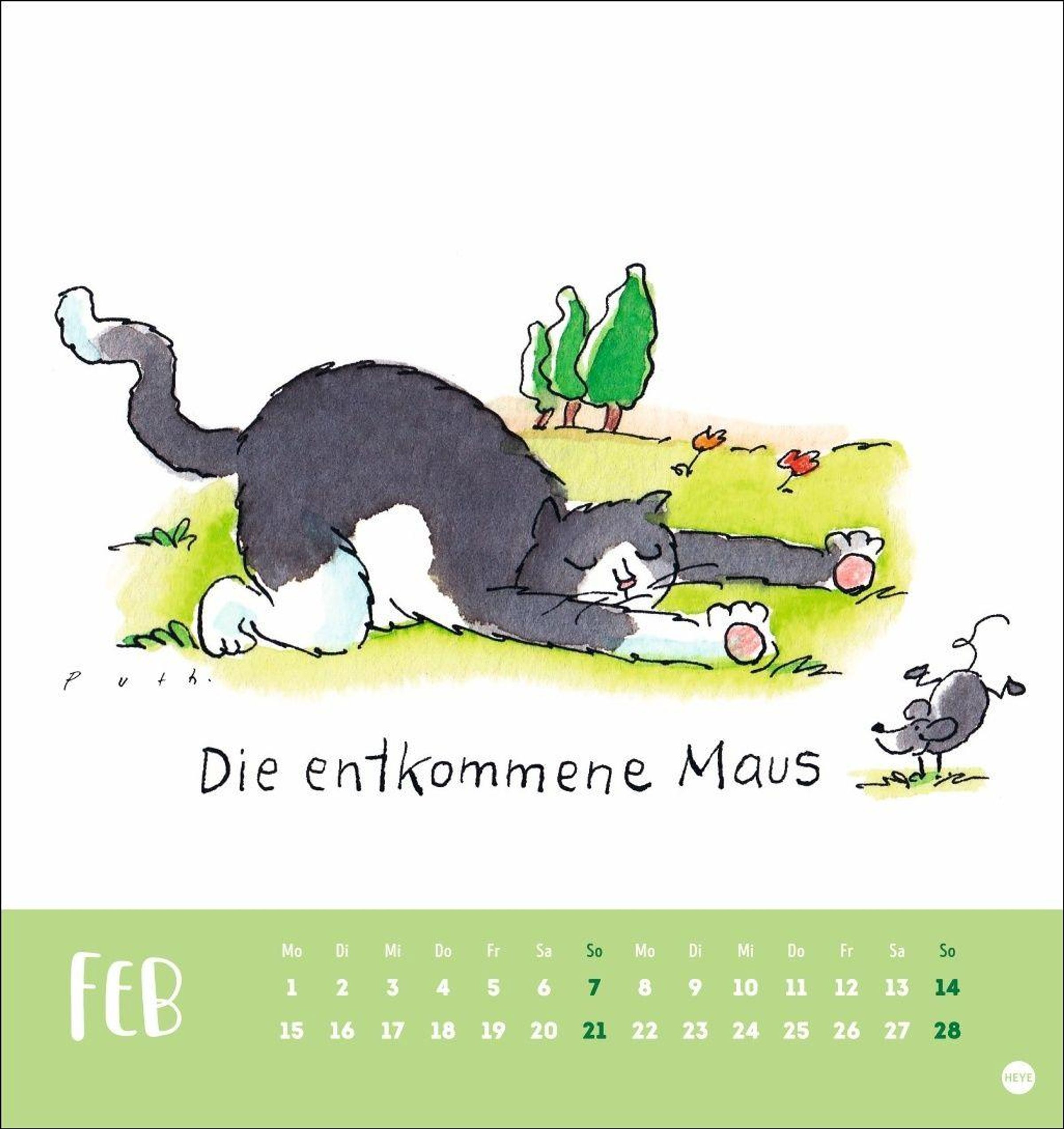 Monat für Monat eine lustige Postkarte zum Sammeln oder Versenden in einem kleinen Katzenkalender mit Zeichnungen von Klaus Puth