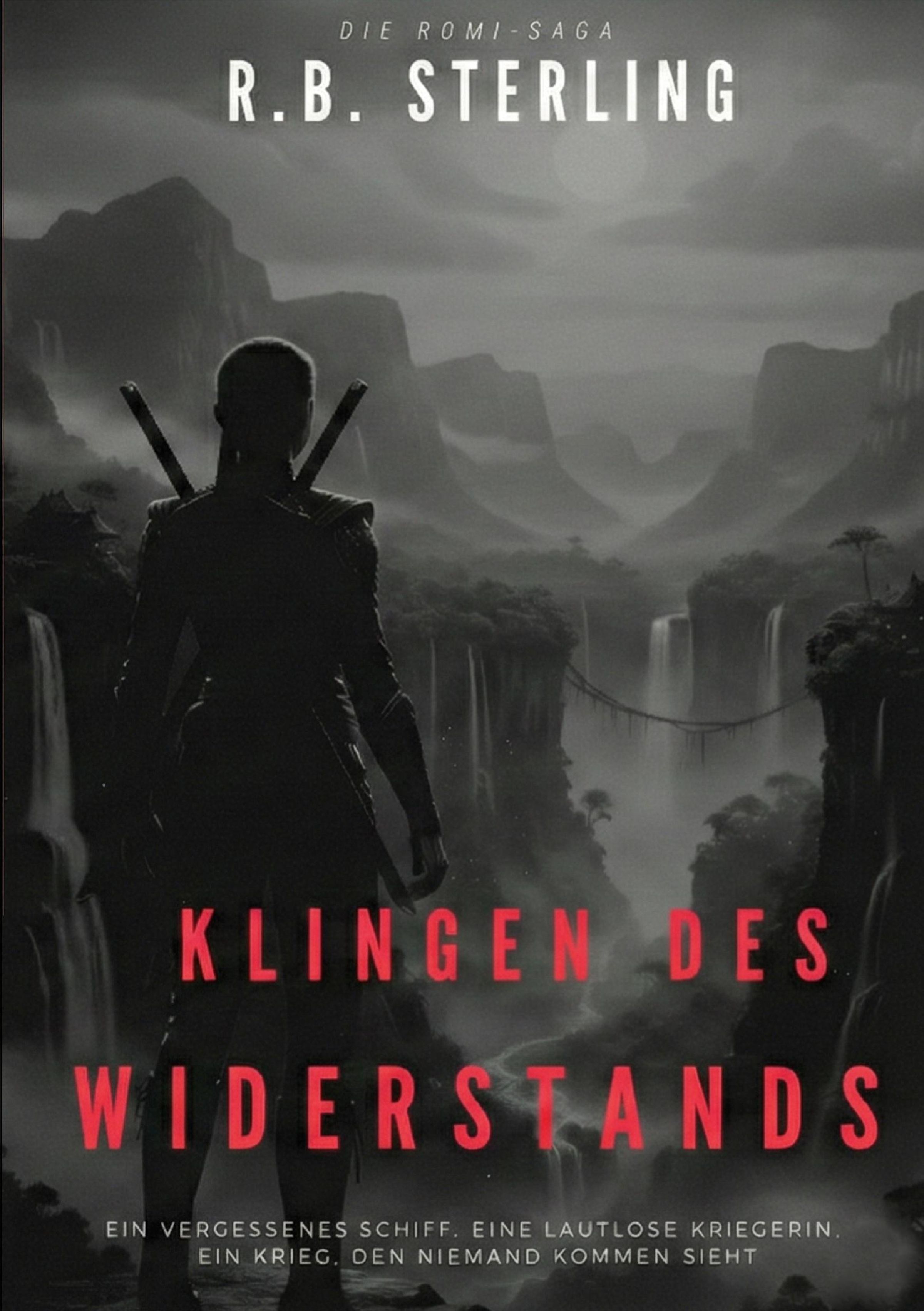 Text: "R.B. Sterling, Klingen des Widerstands." Silhouette einer Person mit Schwertern, vor nebeligen Schluchten., Buch
