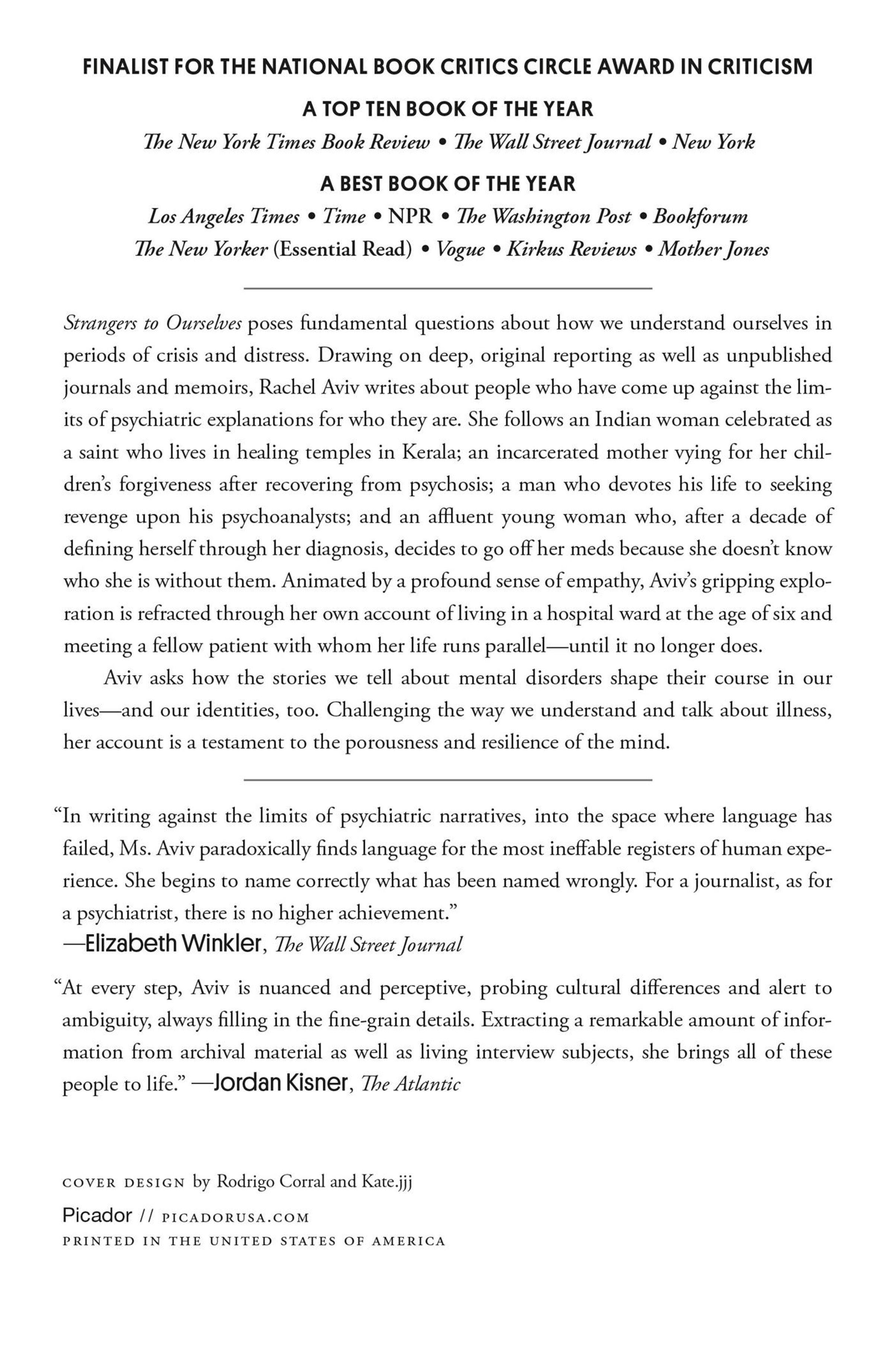 Strangers to Ourselves poses fundamental questions about how we understand ourselves in periods of crisis and distress. Drawing on deep, original reporting as well as unpublished journals and memoirs, Rachel Aviv writes about people who have come up against the limits of psychiatric explanations for who they are. She follows an Indian woman celebrated as a saint who lives in healing temples in Kerala; an incarcerated mother vying for her children's forgiveness after recovering from psychosis; a man who devotes his life to seeking revenge upon his psychoanalysts; and an affluent young woman who, after a decade of defining herself through her diagnosis, decides to go off her meds because she doesn't know who she is without them. Animated by a profound sense of empathy, Aviv's gripping exploration is refracted through her own account of living in a hospital ward at the age of six and meeting a fellow patient with whom her life runs parallel-until it no longer does.