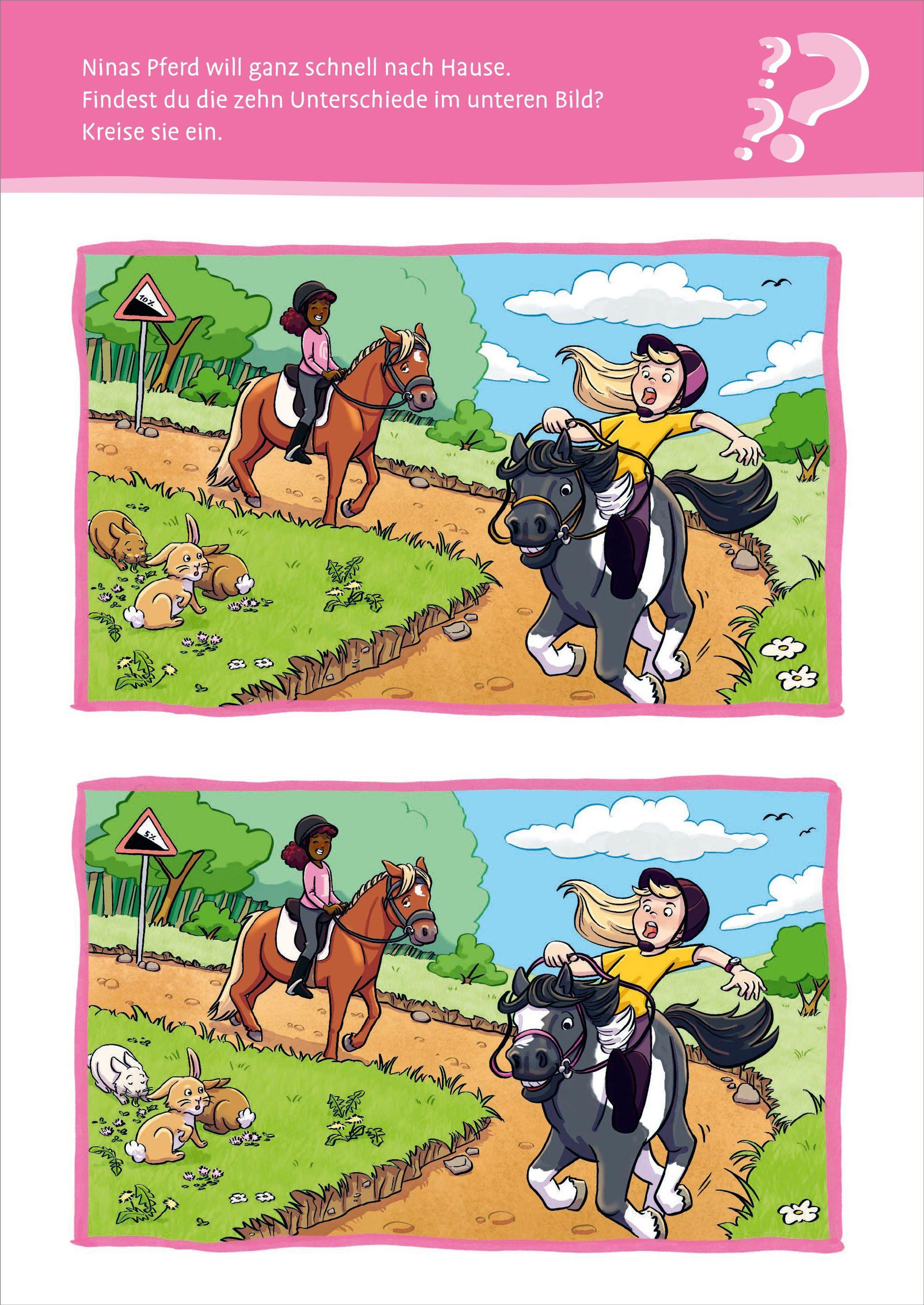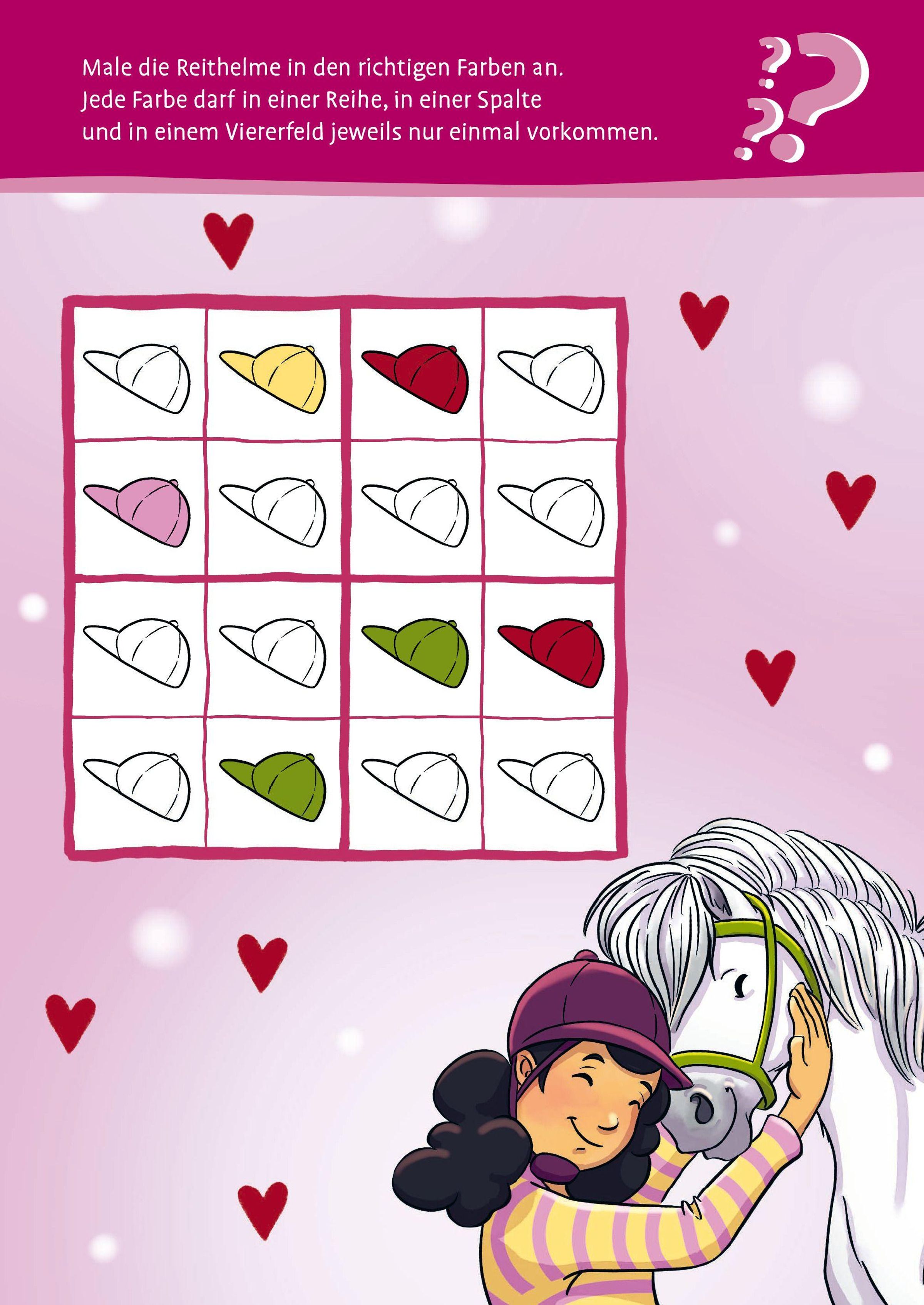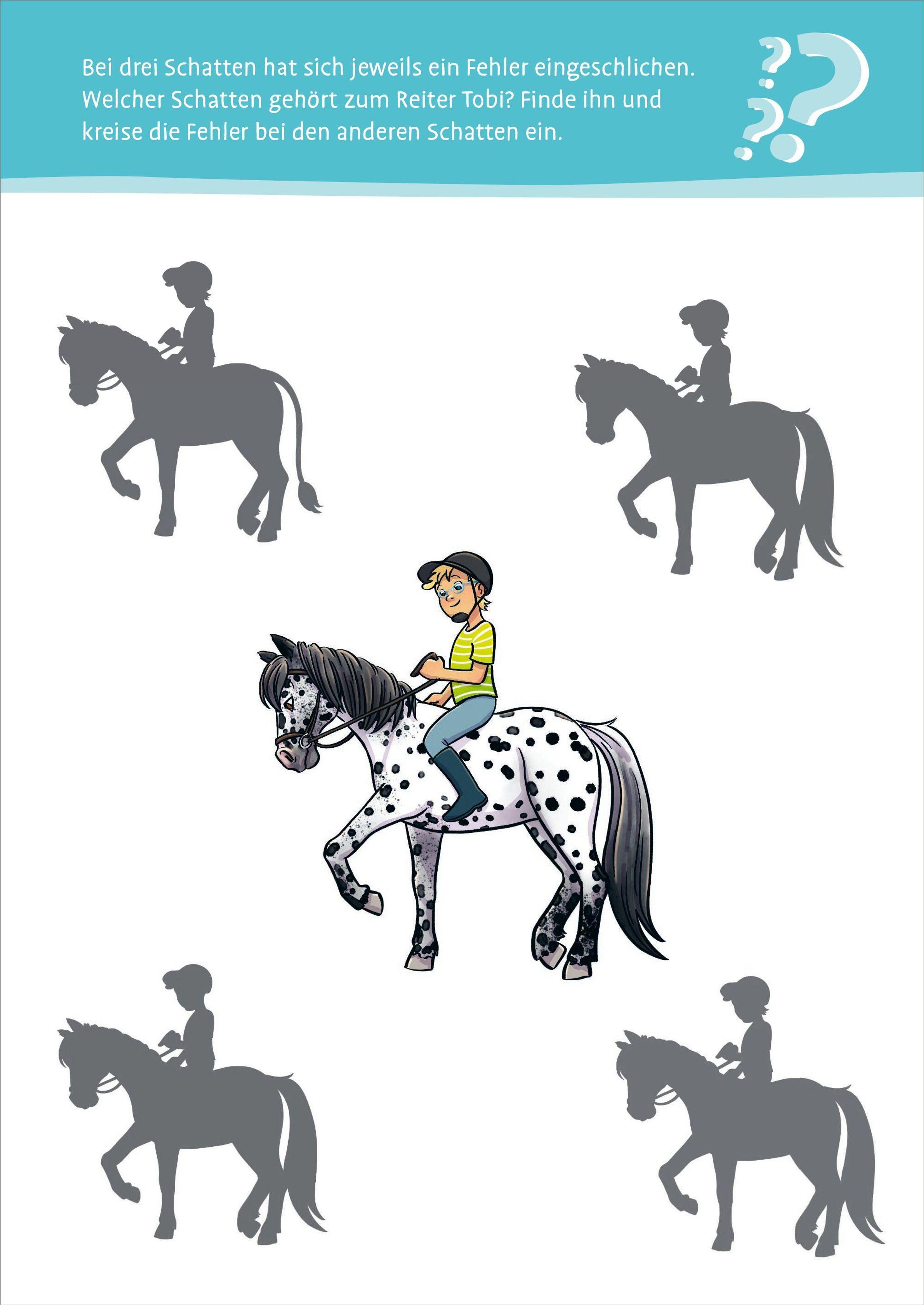 40 pferdestarke Rätsel warten darauf gelöst zu werden! Welches Fohlen gehört zu seiner Mutter? Welcher Bildausschnitt gehört zu dieser Reiterszene? Welche Gegenstände gehören nicht auf den Reiterhof? Welche Kleidung benötigst du zum reiten? Zehn verschiedene Rätselarten zum Knobeln, Zählen, Suchen und finden. Hier ist Köpfchen gefragt! Für Pferdefans ab sechs Jahren.