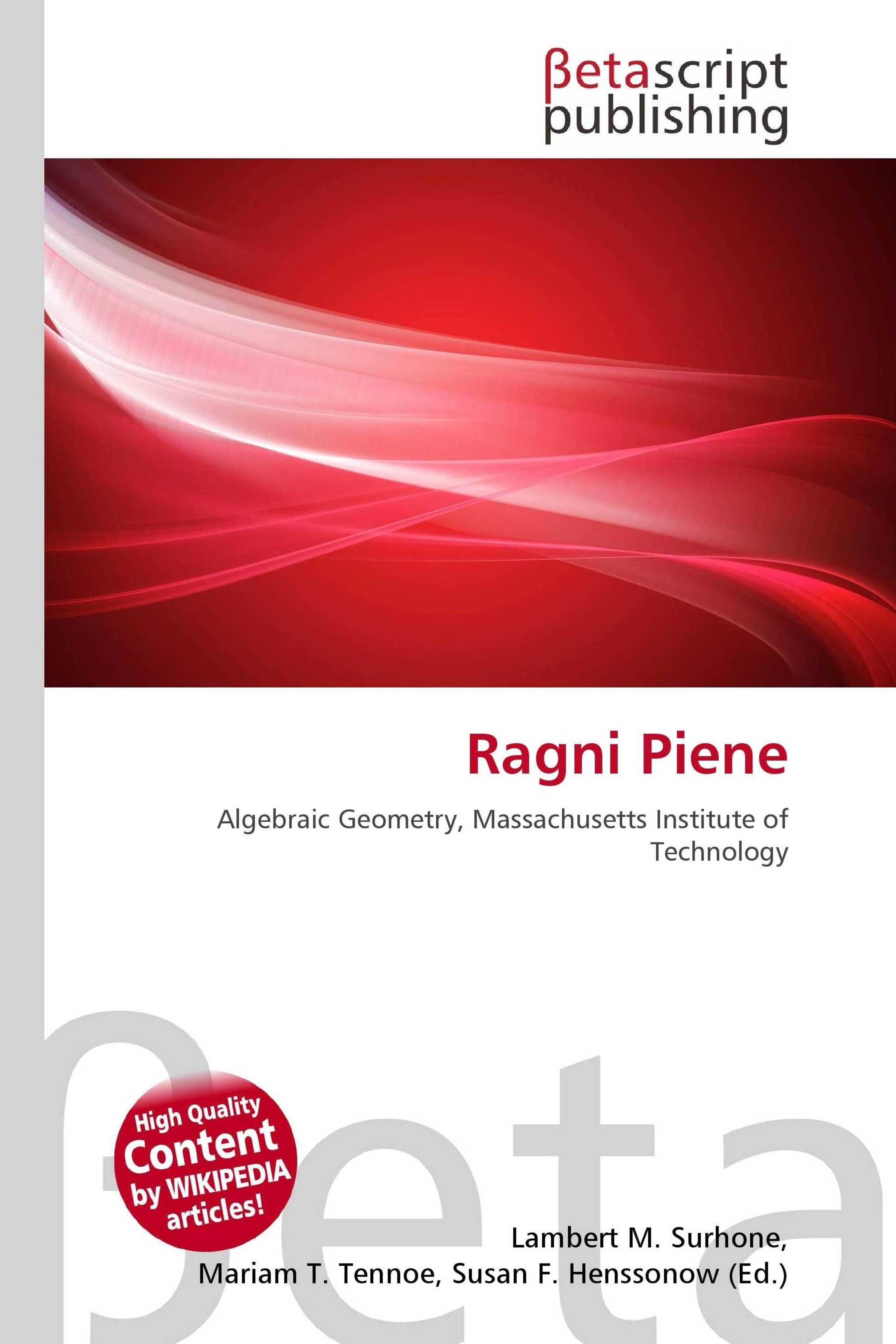 Please note that the content of this book primarily consists of articles available from Wikipedia or other free sources online. Ragni Piene (born 1947) is a Norwegian mathematician. Her field is algebraic geometry. She took her doctorate at the Massachusetts Institute of Technology in 1976, and was appointed professor at the University of Oslo in 1987. She is a member of the Norwegian Academy of Science and Letters. The Massachusetts Institute of Technology (MIT) is a private research university located in Cambridge, Massachusetts. MIT has five schools and one college, containing a total of 32 academic departments, with a strong emphasis on scientific and technological research. MIT is one of two private land-grant universities and is also a sea-grant and space-grant university.