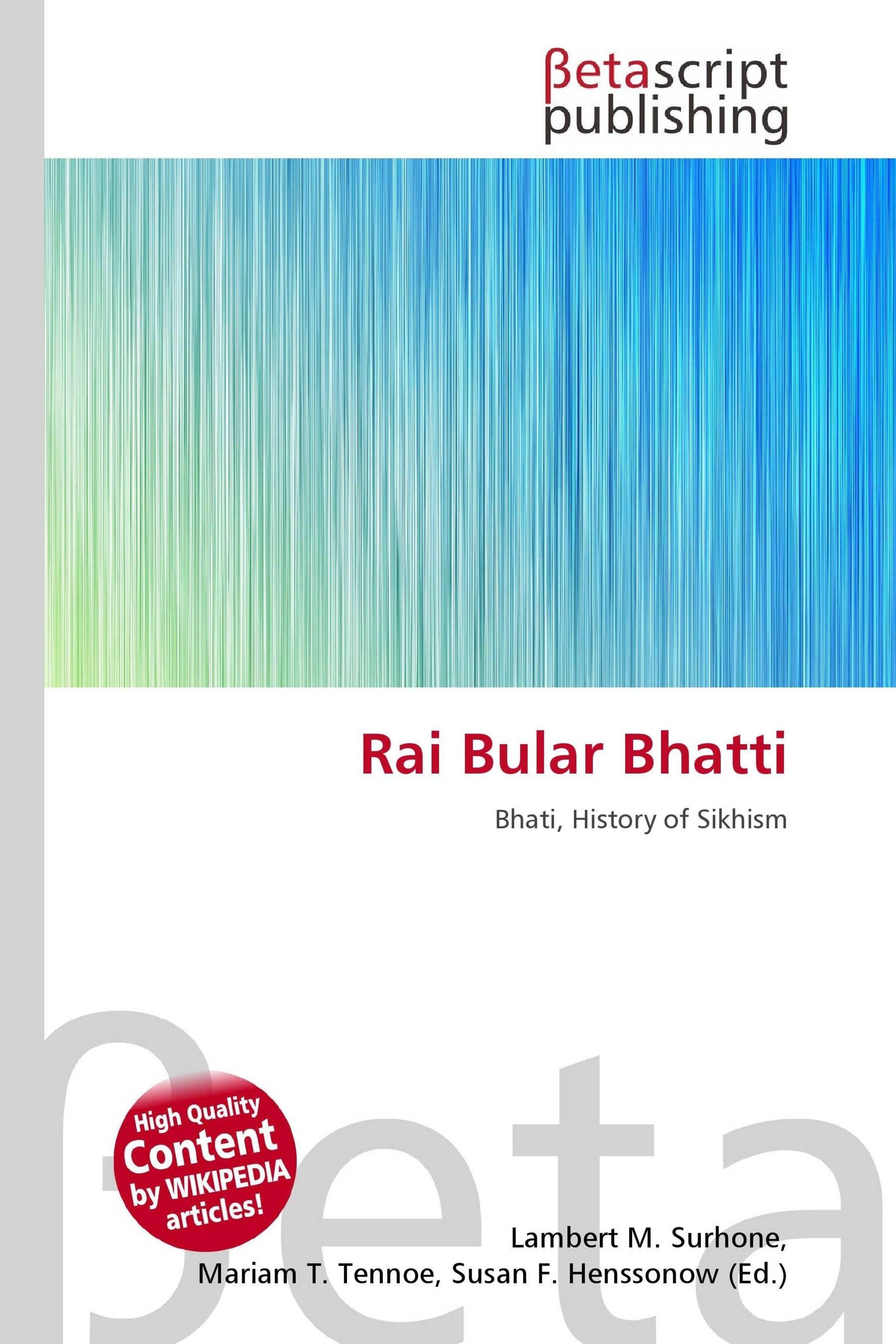 Please note that the content of this book primarily consists of articles available from Wikipedia or other free sources online. Rai Bular Bhatti or Rai (death ca. 1515) was a Muslim noble of the Rajput Bhatti clan during the latter half of the fifteenth century. The Bhatti clan founded the cities of Batinda and Jaisalmir, among others. The exact date of Rai Bular's birth is not known but records kept by bards date it circa 1425 A. D., in the city of Talwandi. This city, which is situated about 42 miles west of Lahore and 18 miles south of the river Ravi, later became known as Nankana Sahib. Rai Bular's father, Rai Bhoe Bhatti, was the landlord owner of over 100, 000 acres of land with Talwandi as its center of commerce; Talwandi thus also became to be known as Rai Bhoe Di Talwandi (Rai Bhoe's Talwandi). Rai Bular was the only son among Rai Bhoe's six children. One of Rai Bhoe's daughter was married to Daulat Khan Lodi, the Governor of the Punjab. After Rai Bhoe's death, his only son Rai Bular became the chief of Talvandi and inherited 20, 000 acres of his estate with the remaining going to his six sisters.