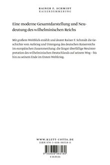 Das wilhelminische Kaiserreich steht bis heute in keinem guten Ruf. Kryptoabsolutismus, Sonderweg und Weltmachtstreben - so lauten die Etiketten, die ihm angeklebt werden. Ein irrlichternder Kaiser, unfähige Kanzler, Welt- und Flottenpolitik nach außen und die zähe Verteidigung der Vorherrschaft der alten Eliten im Innern: All das führte auf den Weg, der im Ersten Weltkrieg endete und den eigenen Untergang besiegelte. Rainer Schmidts glänzend geschriebene Darstellung bietet eine alternative Sichtweise zu diesem gängigen Bild. Umfassend beschreibt er das wilhelminische Reich in seinen wichtigsten Strukturen, aber auch in seinen modernen Elementen. In einem grandiosen Panorama schildert und deutet der Autor die internationalen Beziehungen zwischen 1890 und 1918 nicht monokausal von Berlin her, sondern bettet sie in den gesamteuropäischen Kontext ein. Dabei ergibt sich der Befund einer komplexen Gemengelage, die 1914 in den Krieg mündete: eigene Fehleinschätzungen, die Berlin in die Isolation führten, aber auch eine gezielte Einkreisungs- und Erpressungsstrategie der anderen Mächte, womit die große Katastrophe fast unausweichlich wurde. Eine fulminante Gesamtdarstellung und brisante Neuinterpretation einer der umstrittensten Epochen der deutschen Geschichte, über die man lange diskutieren wird.