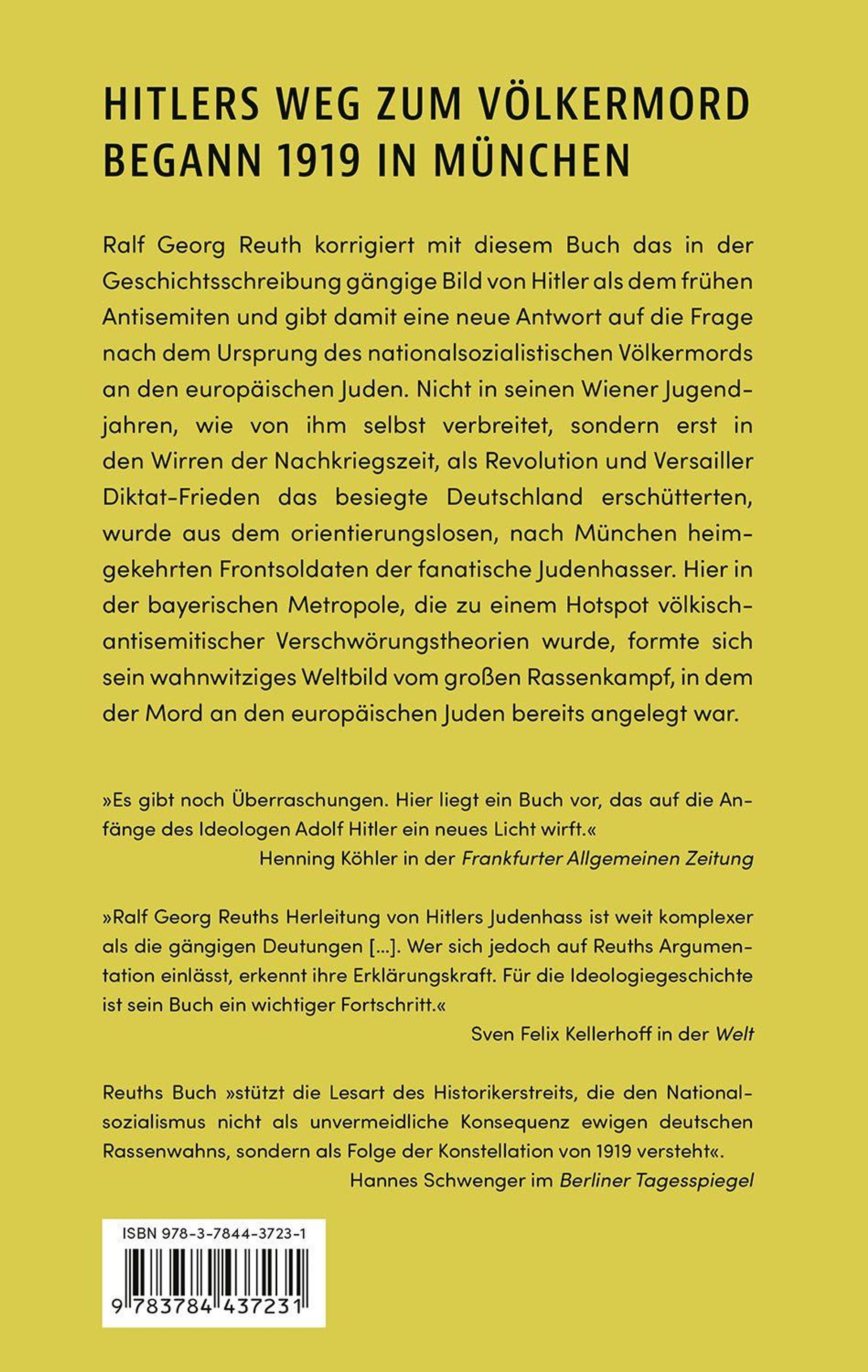 Wurzelt Hitlers wahnhafter Vernichtungsantisemitismus bereits in seiner Wiener Zeit vor dem Ersten Weltkrieg, wie er in seinem Buch "Mein Kampf" behauptet? Oder ist sein fanatischer Judenhass dem Chaos der Nachkriegsjahre geschuldet, als Revolution sowie Versailler Vertrag Deutschland zutiefst erschütterten und München zu einem Hotspot völkisch-antisemitischer Verschwörungstheorien wurde? Für Letzteres spricht vieles, wie der Historiker Ralf Georg Reuth nachweist. Denn weder in Hitlers frühen Jahren noch in denen als Weltkriegskämpfer findet sich ein einziges antisemitisches Zeugnis von ihm. Vom Februar 1919 existieren sogar Aufnahmen, die ihn beim Begräbnis des ermordeten bayerischen Ministerpräsidenten, dem jüdisch-stämmigen Linkssozialisten Kurt Eisner zeigen. Und kurz darauf - während der als "jüdisch" apostrophierten Baierischen Räterepublik - ließ sich Hitler nachweislich zum Soldatenrat der "Roten Armee" wählen. Der spätere Diktator war - so Reuth - zunächst ein Mitläufer, dessen Weg zum Judenhasser erst nach dem Ende der kurzen Herrschaft der Räte und unter dem Eindruck der verheerenden Friedensbedingungen des Versailler Vertrags im Frühjahr 1919 begann. Reuth räumt in seinem Buch mit dem von Generationen von Historikern von Hitler übernommenen Bild vom frühen Judenhasser auf und gibt eine neue Antwort auf die Frage nach den Wurzeln des Völkermords an den europäischen Juden.