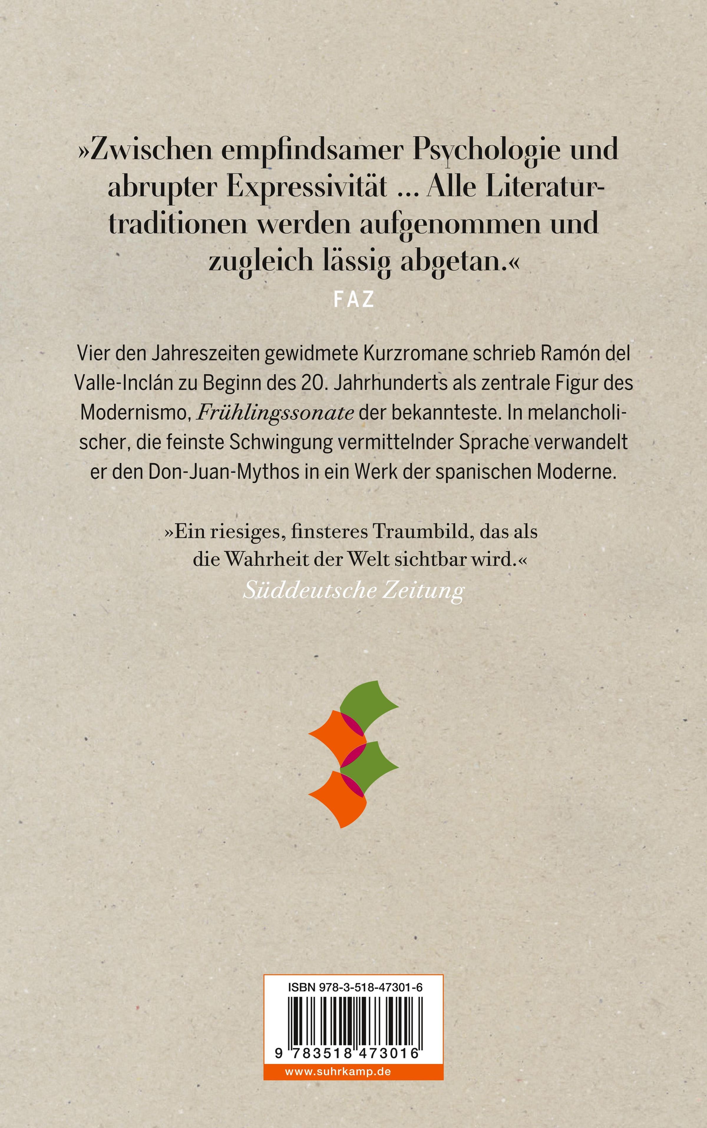 Als junger Mann wird Marqués de Bradomín auf Weisung des Papstes an den florentinischen Hof Liguras entsandt. Der Herr der Stadt soll aus seinen Händen den Kardinalshut empfangen. Doch der Empfänger liegt im Sterben, und als Marqués de Bradomín die älteste der fünf bildhübschen Töchter der Fürstin erblickt, ändern sich seine Pläne. Die Verführung María Rosarios, längst dem Kloster versprochen, nimmt seinen Lauf. Doch sein Geschick, sein Wille, das Spiel mit Schuld und Imagination kostet ein Opfer, das nicht wiedergutzumachen ist. Vier den Jahreszeiten gewidmete Kurzromane schrieb Ramón del Valle-Inclán zu Beginn des 20. Jahrhundert als zentrale Figur des Modernismo, Frühlingssonate der bekannteste. In melancholischer, die feinste Schwingung, Regung, Alteration vermittelnder Sprache verwandelt er den Don-Juan-Mythos in einen Urtext der der spanischen Moderne.Anmerkungen: