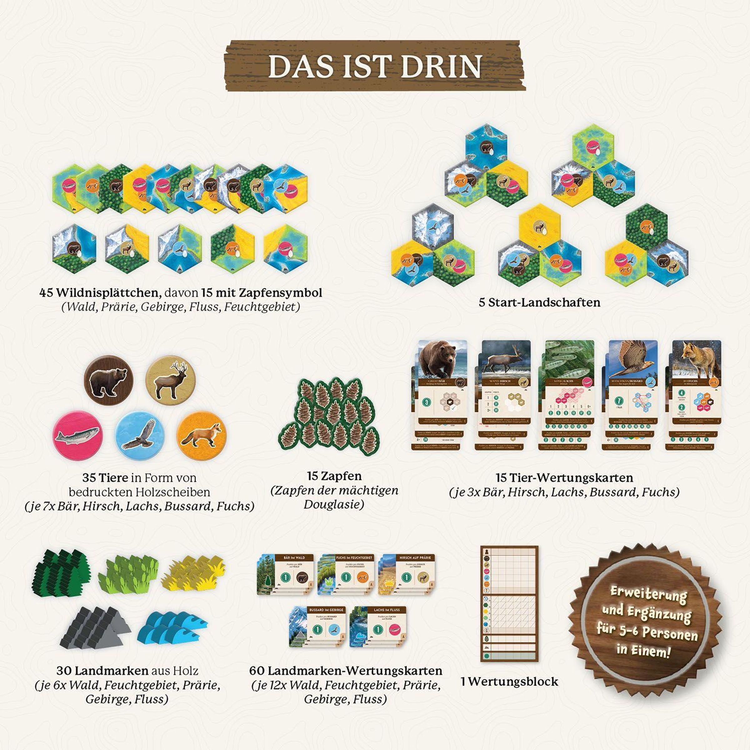 Cascadia wächst weiter! Endlich das "Spiel des Jahres 2022" mit bis zu 6 Personen spielen und zusätzliche Spielelemente entdecken. Mit dieser Erweiterung weiterhin weitläufige Lebensräume erschaffen und neue schöne natürliche Wahrzeichen, die Landmarken, darin platzieren. Diese verleihen jeder Umgebung ihr eigenes Aussehen und ermöglichen wertvolle Punkte bei Spielende. Zusätzlich enthalten sind neue Wertungskarten für die Tiere. Die Erweiterung ist nur mit dem Grundspiel spielbar. Für Familien ab 10 Jahren.
