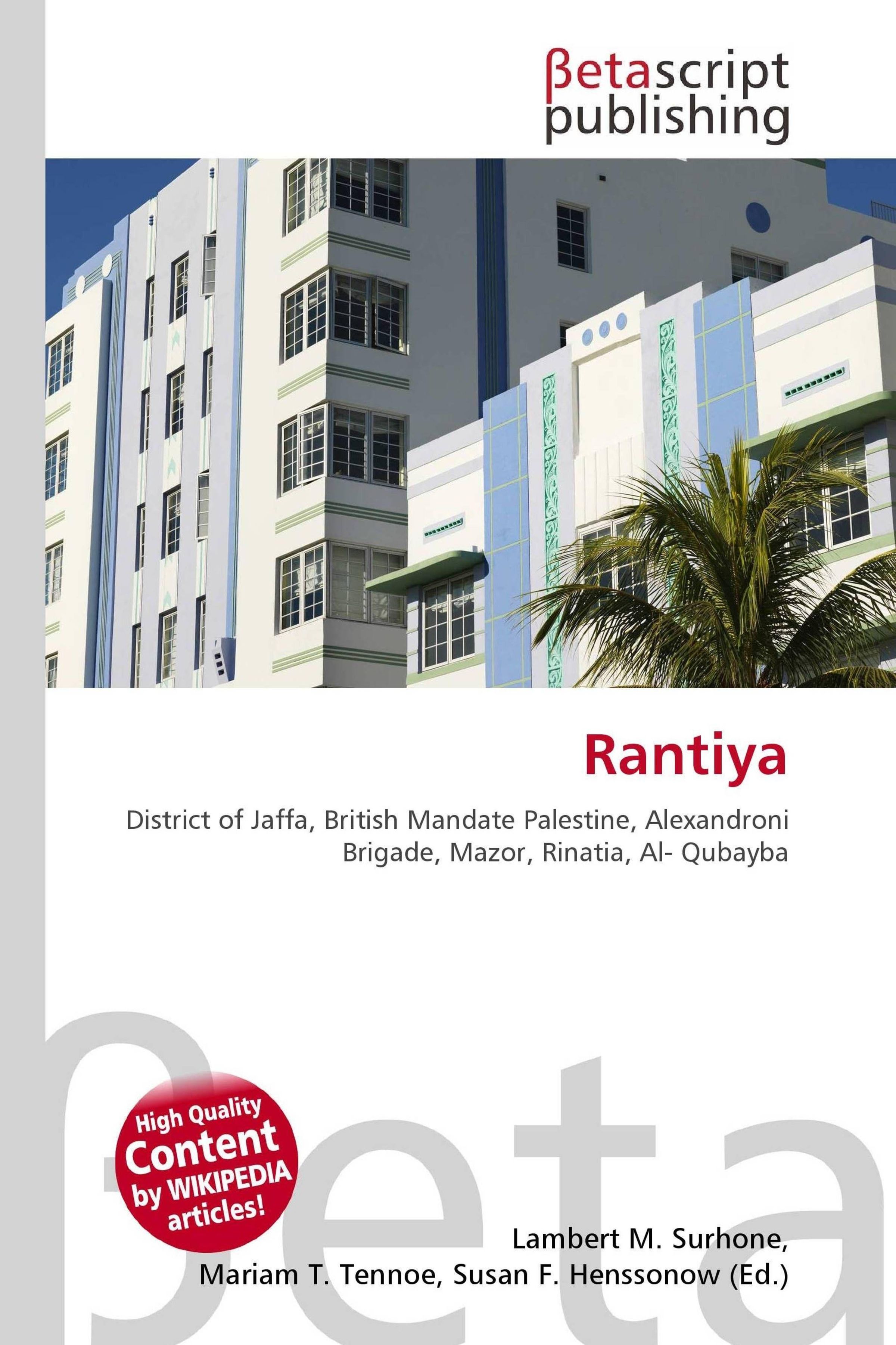 Please note that the content of this book primarily consists of articles available from Wikipedia or other free sources online. Rantiya (Arabic: , known to the Romans as Rantia and to the Crusaders as Rentie) was a Palestinian village, located 16 kilometers east of Jaffa. During the British Mandate in Palestine, it had a population of approximately 600 inhabitants. Those inhabitants became refugees after a 10 July 1948 assault by Israeli forces from the Palmach's Eighth Armored Brigade and the Third Infantry Battalion of the Alexandroni Brigade during the 1948 Arab-Israeli war. Of the over 100 houses that made up the village, only three remain standing today. The Jewish localities of Mazor, Nofekh, and Rinatia are located on Rantiya's former lands.