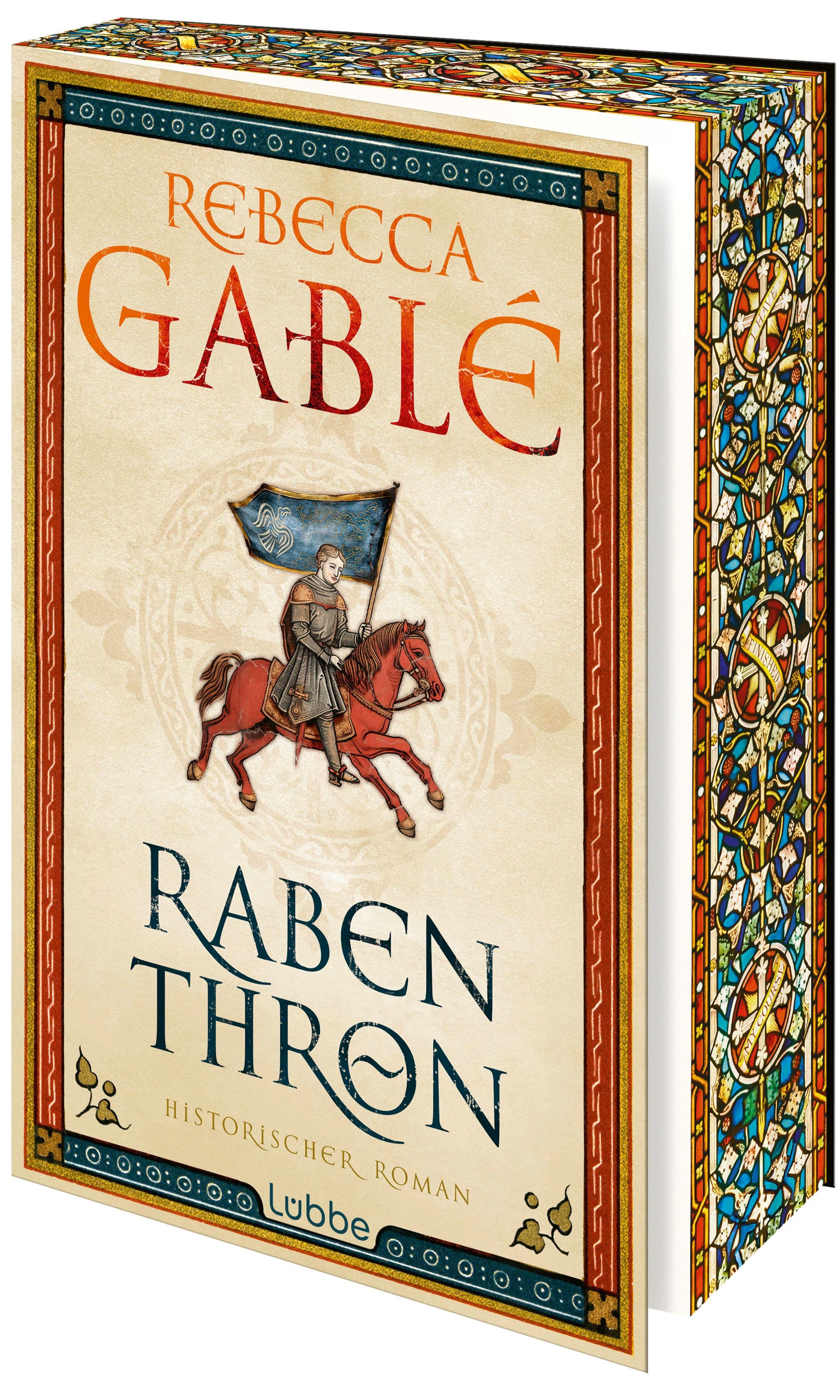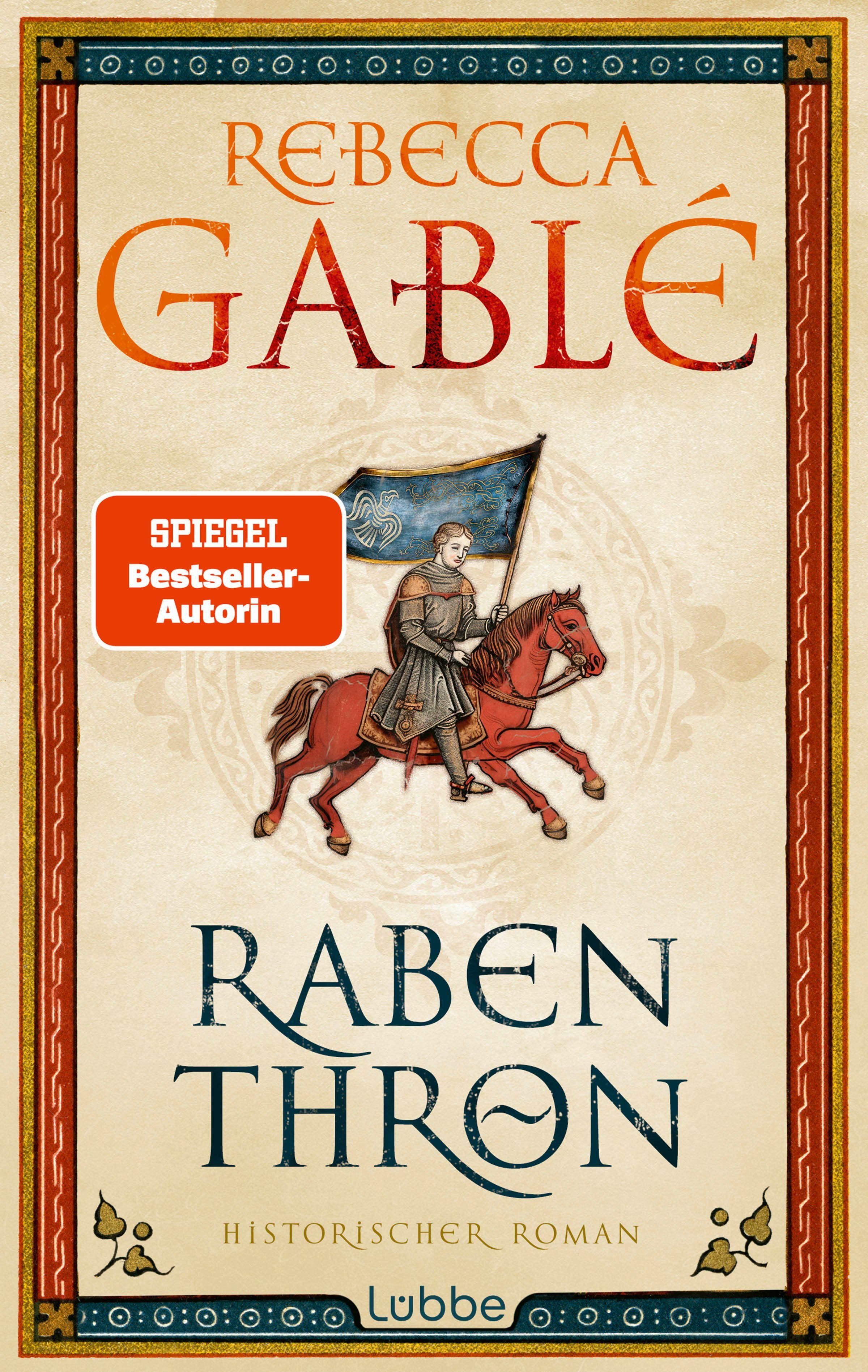 "Rebecca Gablé, Raben Thron, Historischer Roman, Lübbe." Illustration: Reiter auf rotem Pferd mit Fahne, goldener Rand., Buch