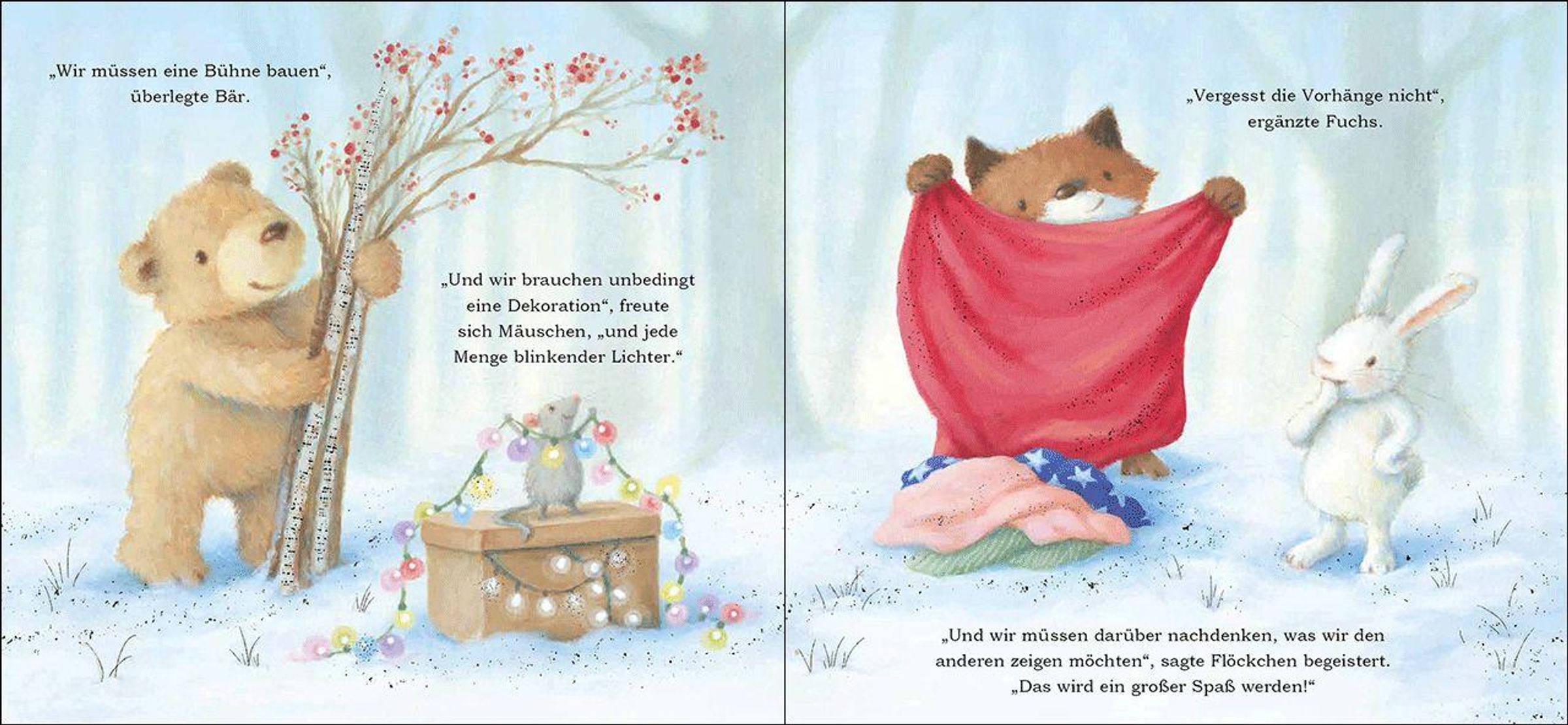 Der kleine Hase Flöckchen und seine Freunde bereiten eine Weihnachtsaufführung für die Tiere im Wald vor. Flöckchen unterstützt Mäuschen, Fuchs und Bär eifrig mit Ideen für Ihre Auftritte. Doch als alle gespannt auf die Vorstellung warten, stellt der kleine Hase traurig fest, dass er als Einziger nichts für die Vorführung vorbereitet hat. Aber schon sind seine Freunde zur Stelle. Ob sie es schaffen, ihm zu helfen? Dieses bezaubernde Bilderbuch zeigt, was Hilfsbereitschaft und Freundschaft alles bewirken können.