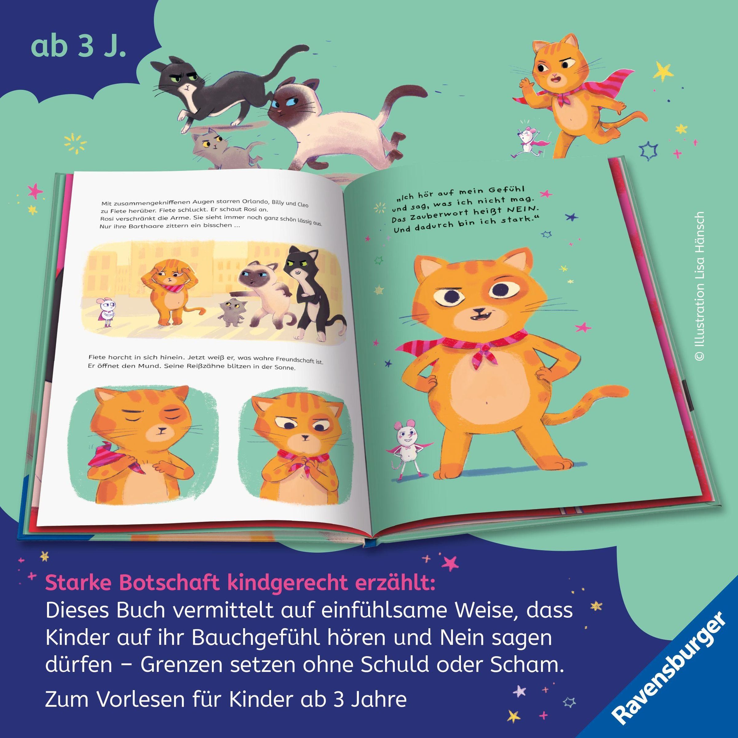 Text: "Das Zauberwort heißt nein!" Darstellung eines Kätzchens, das von einer Maus mit einem Cape begleitet wird. Bunter Hintergrund., Buch