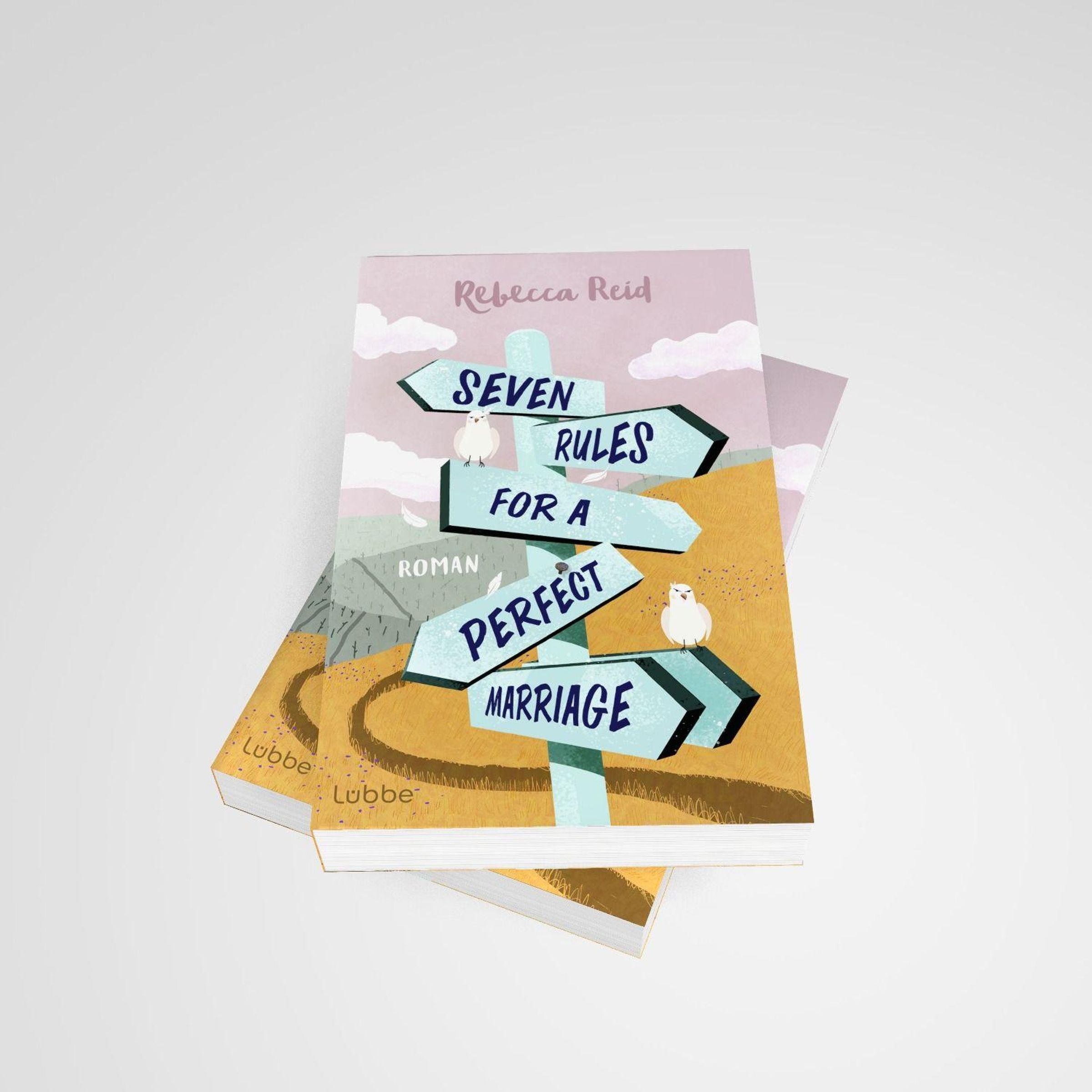 „Seven Rules for a Perfect Marriage“, Roman von Rebecca Reid. Schild mit Vögeln in einer ländlichen Landschaft., Buch