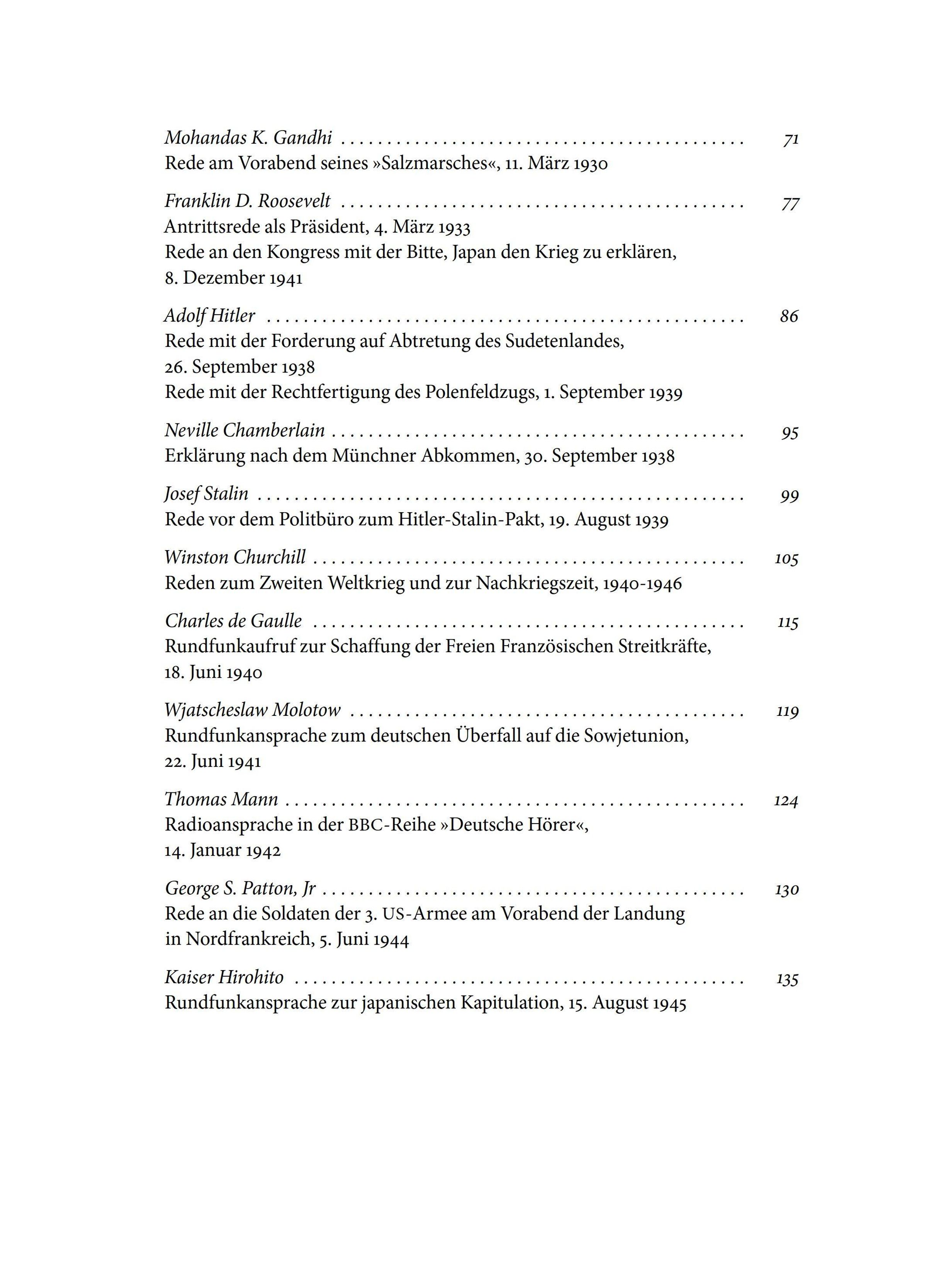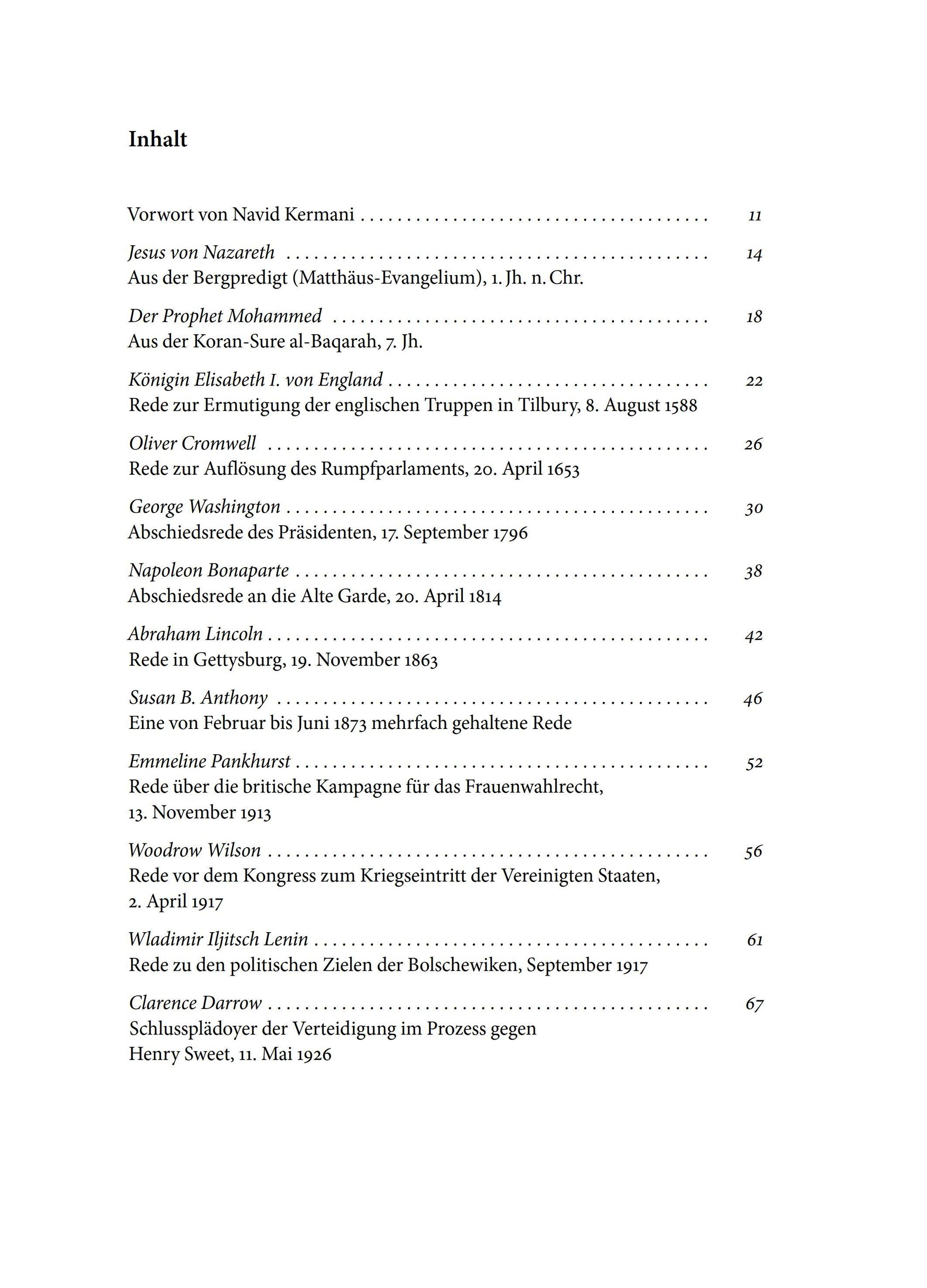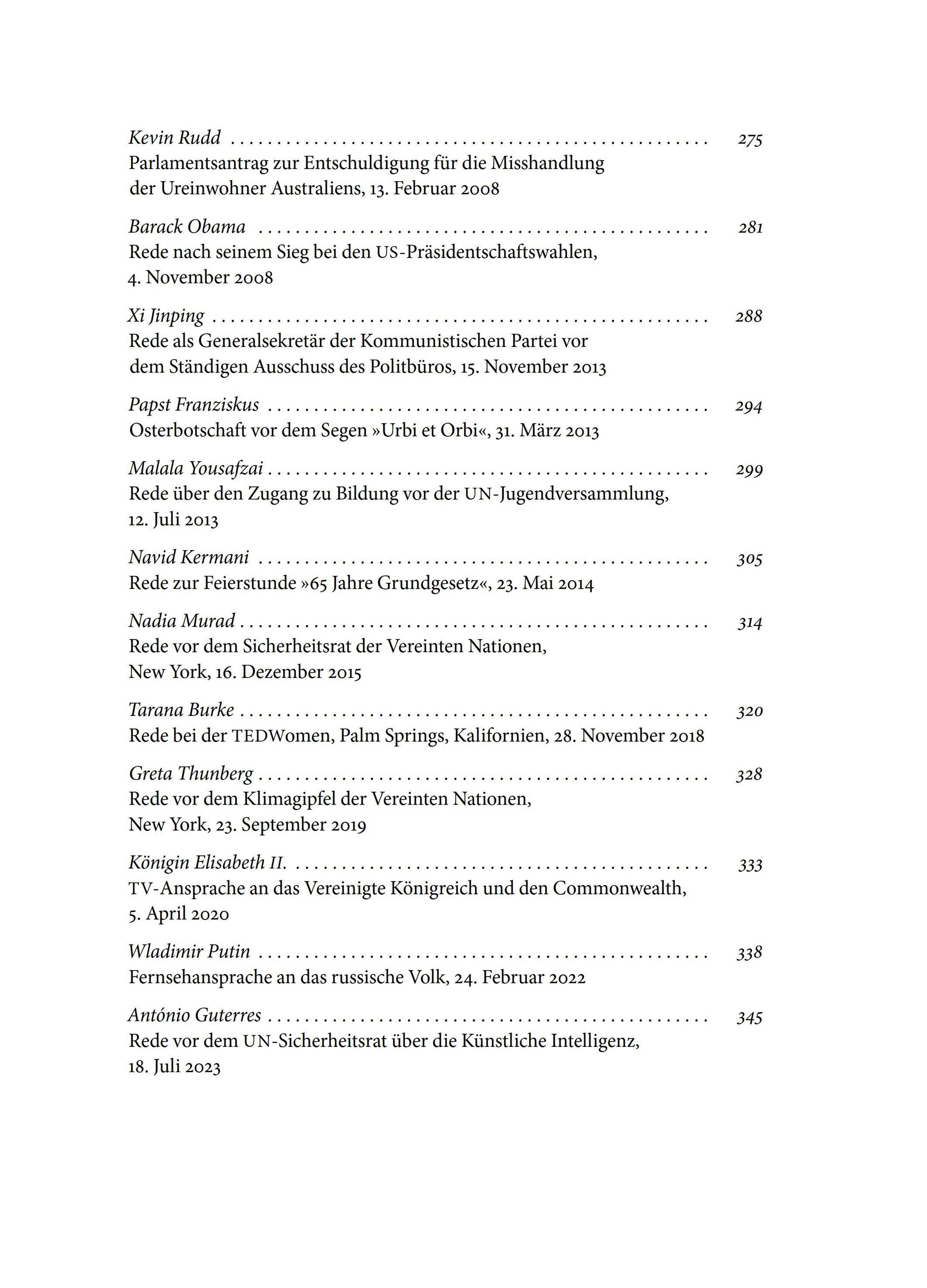 Dieses Buch versammelt rund 70 der berühmtesten Reden aller Zeiten und Sprachen: von Kriegserklärungen zu flammenden Appellen für den Frieden, von den Propheten der großen Religionen über Barack Obamas Rede 2008 bis zu Ansprachen von António Guterres oder Wolodymyr Selenskyj in neuerer Zeit.