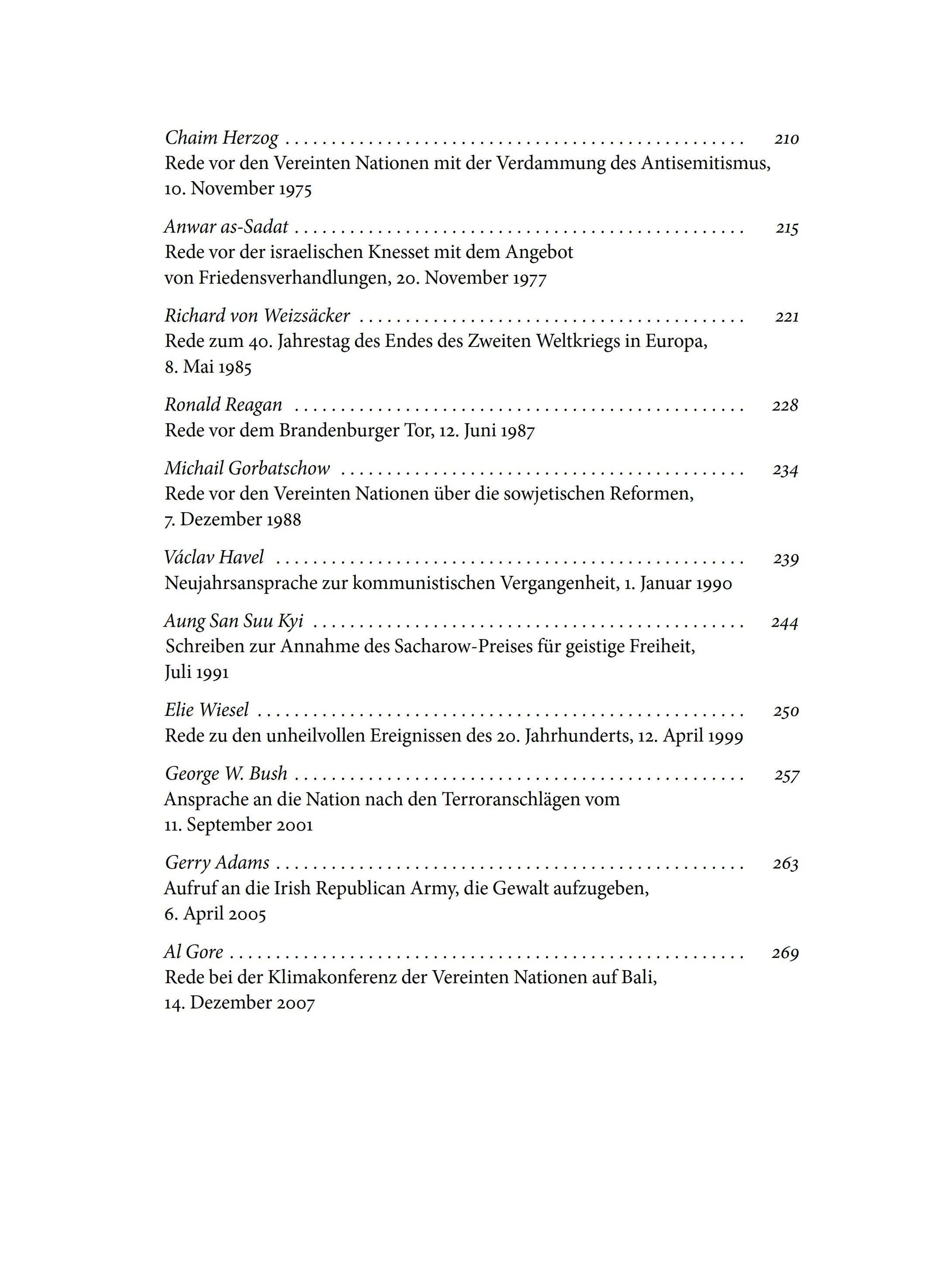 'I have a dream' - Martin Luther Kings epochemachende Rede ist nur ein Beispiel für die Macht, mit der das gesprochene Wort in die Geschichte der Menschheit eingegriffen hat. Aussichtslosen Situationen haben solche Reden ebenso Ausdruck gegeben wie großen Hoffnungen und Visionen. Sie haben Leidenschaften - im Guten wie im Bösen - entfesselt, aber auch zur Besinnung aufgerufen, haben Wendepunkte der Geschichte markiert, Zeitalter beendet und Entwicklungen losgetreten. Das 'Blut, Schweiß und Tränen', mit dem Winston Churchill seine Nation auf den Widerstand gegen Hitler einstimmte, ist dafür ebenso ein Beispiel wie Abraham Lincolns 'Gettysburg Address', Indira Ghandis Forderung nach Bildung für alle, Nelson Mandelas Rede nach dem Wahlsieg des ANC, Richard von Weizsäckers Rede am 8. Mai 1985 oder in neuerer Zeit wegweisende Ansprachen von Greta Thunberg oder Papst Franziskus.