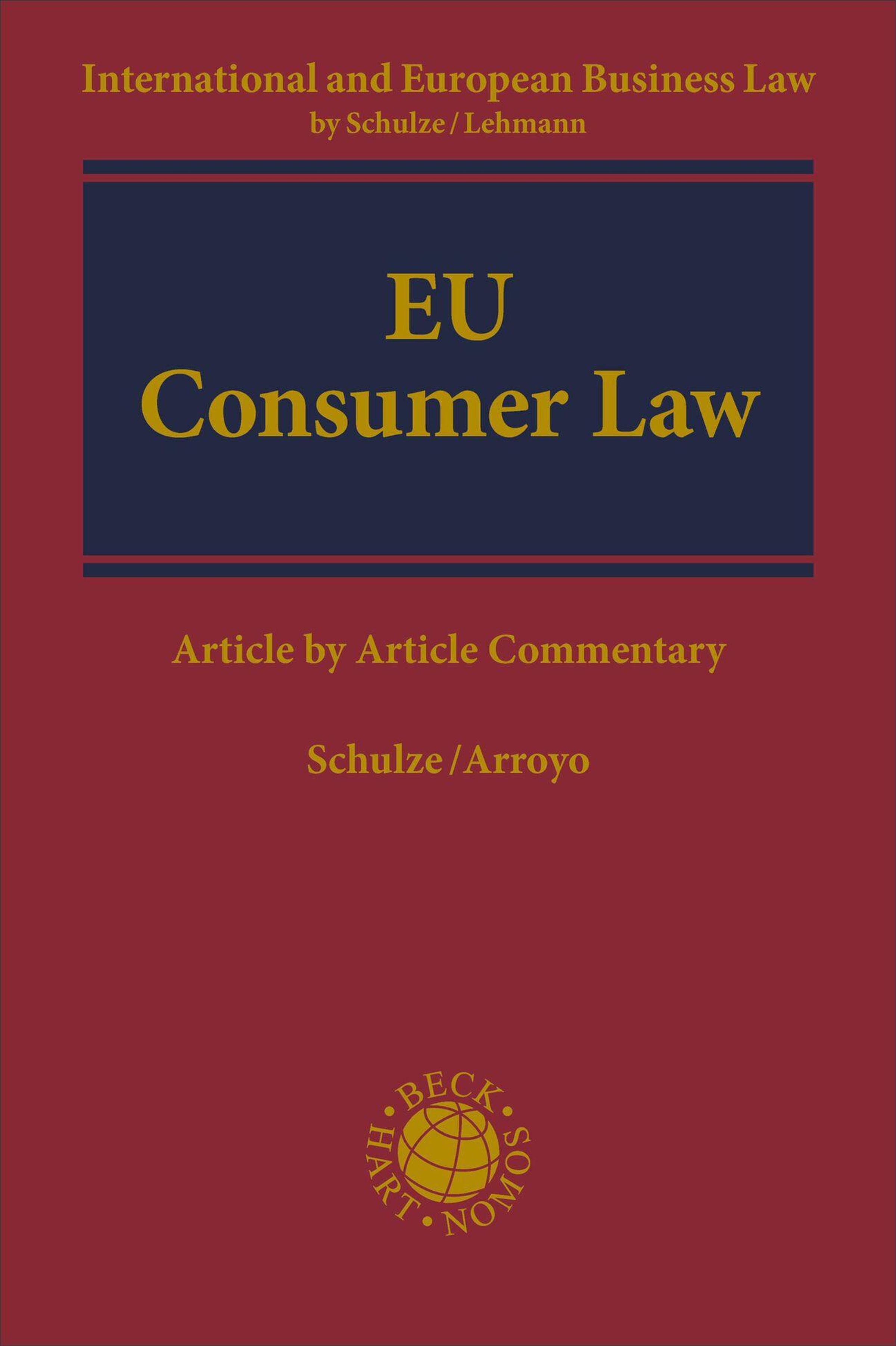 "EU Consumer Law" in gelber Schrift auf blauem Hintergrund. Oben und unten rote Flächen mit weiteren Texten., Buch