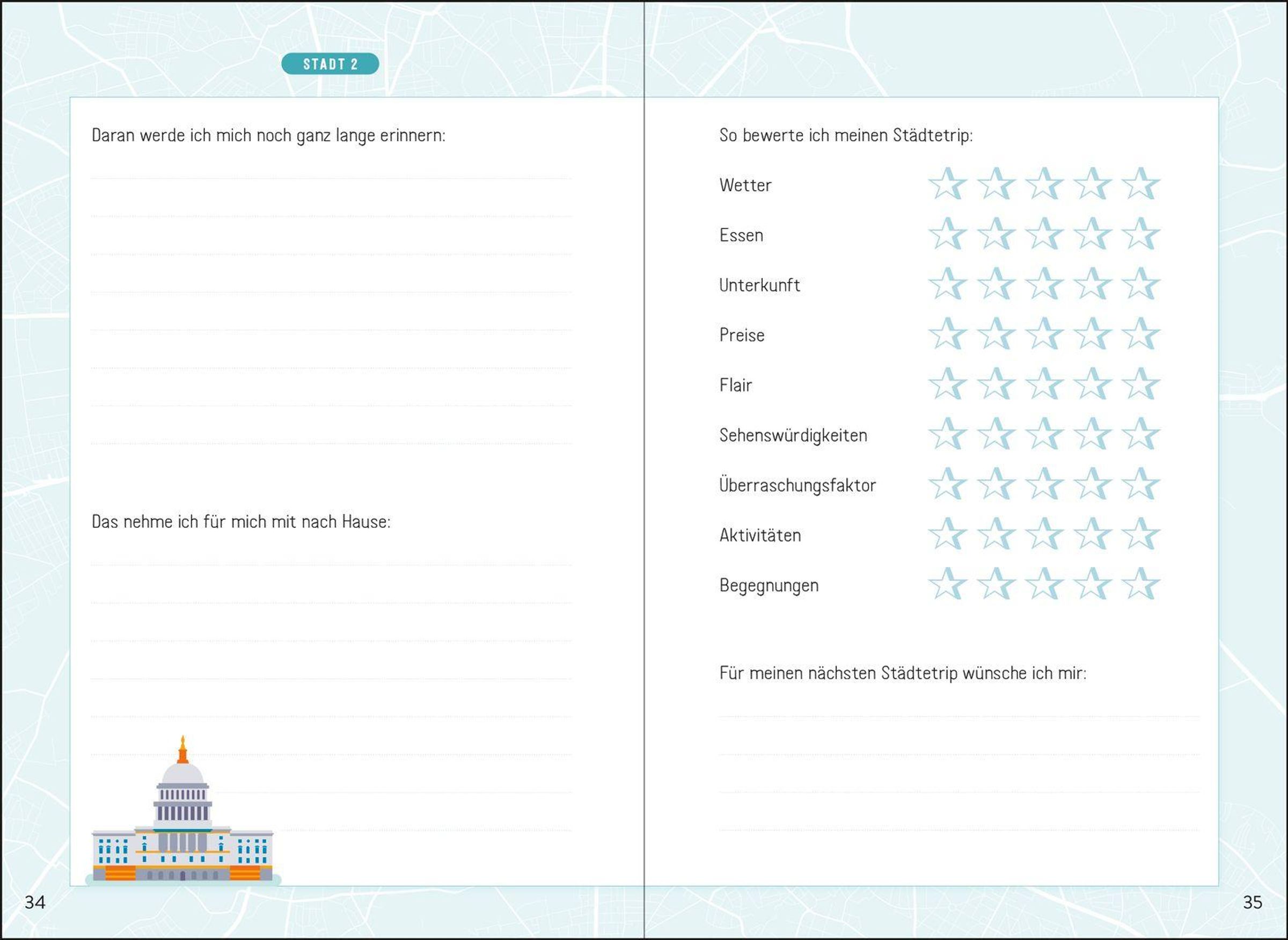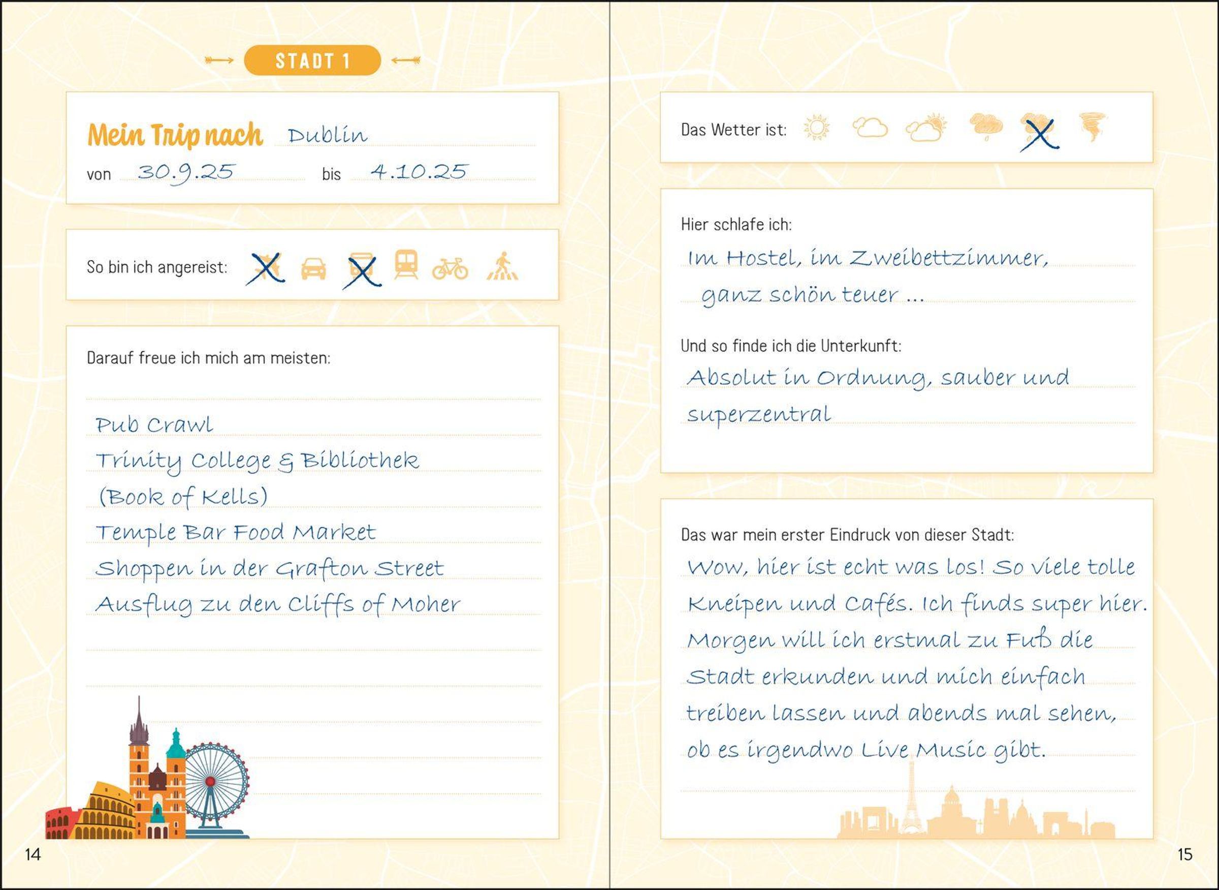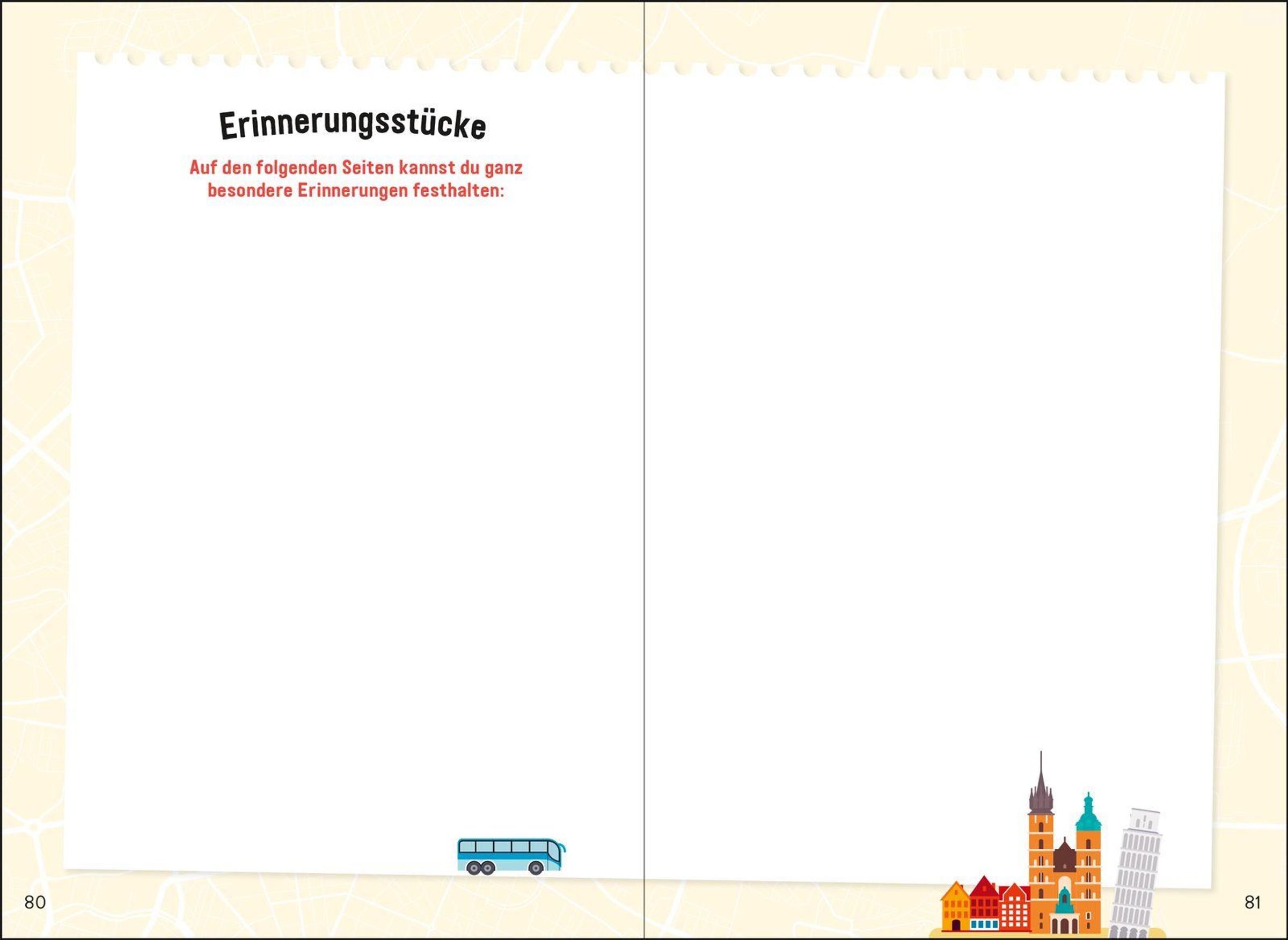 - Travel Diary mit geführten Eintragseiten für bis zu fünf Städte