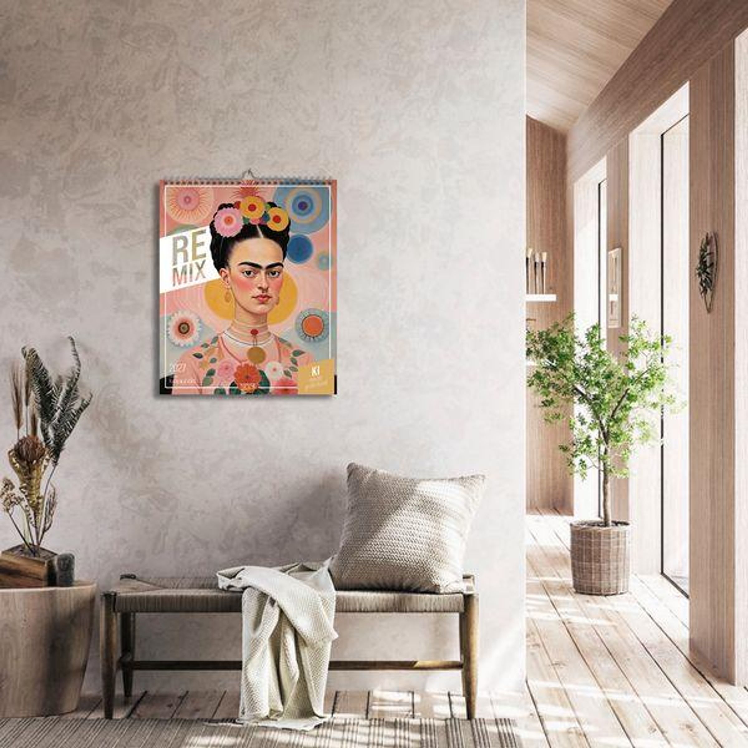 "RE MIX", "2027", "Titelbild: Kahlo x af Klint", "KI mischt große Kunst". Frau mit Blumen im Haar, bunte Kreise im Hintergrund., Kalender