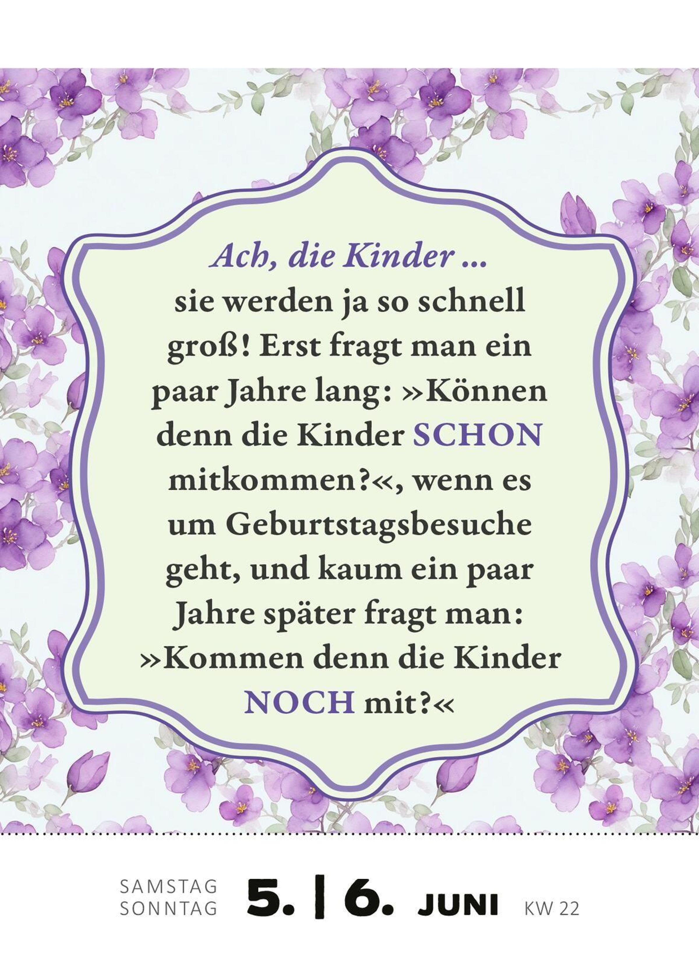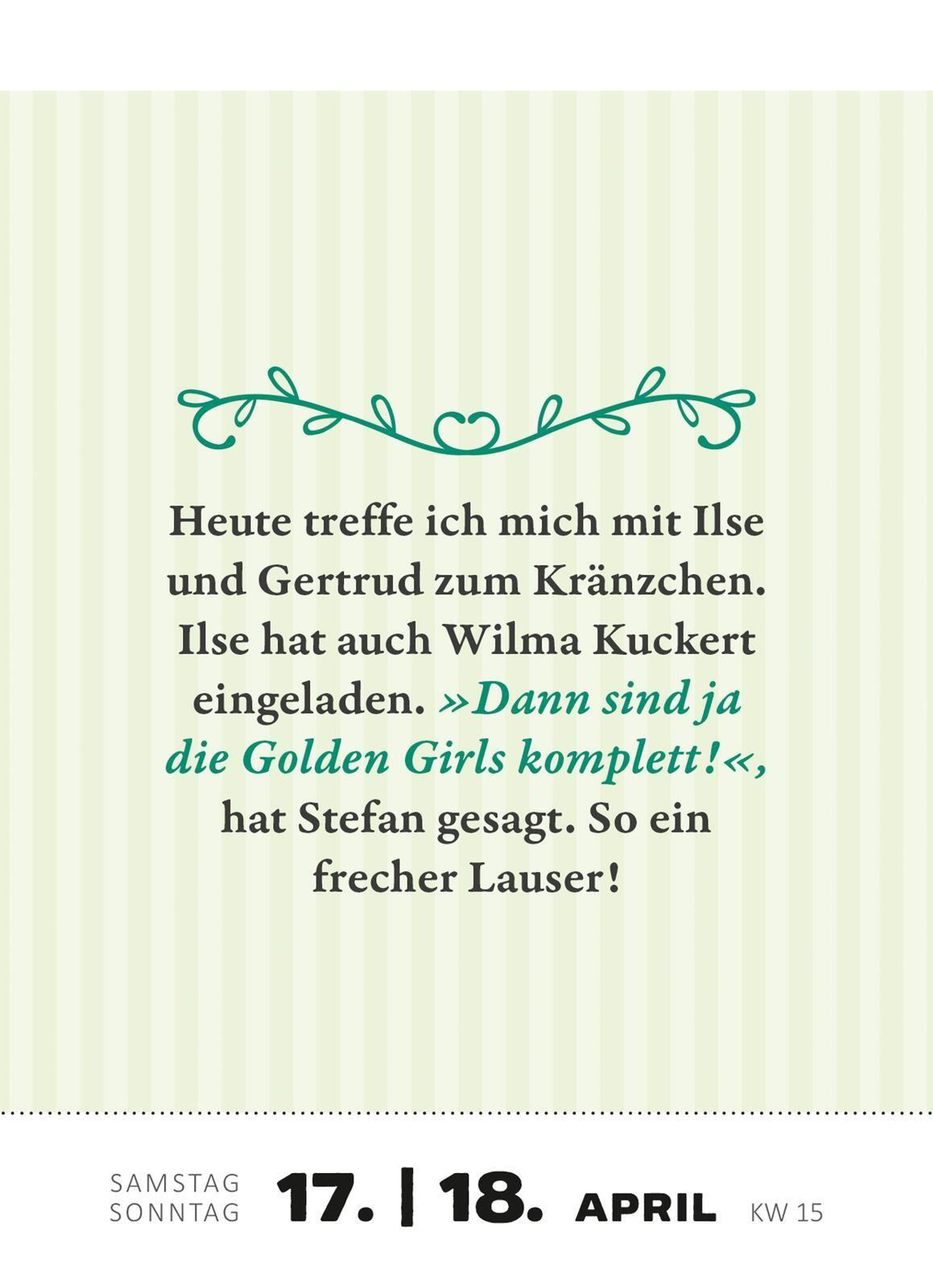 "Wissen Se, das Leben ist was, wo man durchmuss", würde Frau Bergmann sagen. Aber doch bitte mit einer großen Portion Humor und Gelassenheit! Die beliebte Oma aus Berlin-Spandau ist 82 Jahre alt und eine "ganz normale" ältere Dame. Wenn sie nicht mit ihrer Freundin Gertrud unterwegs ist, den Haushalt und die Einkäufe erledigt, ihre Männer auf dem Friedhof gießt oder mit Gläsers im Seniorenverein feiert, twittert sie am liebsten ihre Lebenstipps im "Interweb". Dieser kleine Tischkalender mit einem "Best-of" der Renate-Sprüche sorgt jeden Tag im Jahr 2027 für gute Laune. Er lässt sich aufhängen oder aufstellen und ist damit ein Blickfang für deinen Schreibtisch im Büro oder Homeoffice, für den Nachttisch oder die Wand in deinem Wohnzimmer. In diesem Tageskalender finden sich jede Menge Weisheiten und flotte Sprüche der Twitter-Oma - da können Se sich noch was abgucken!