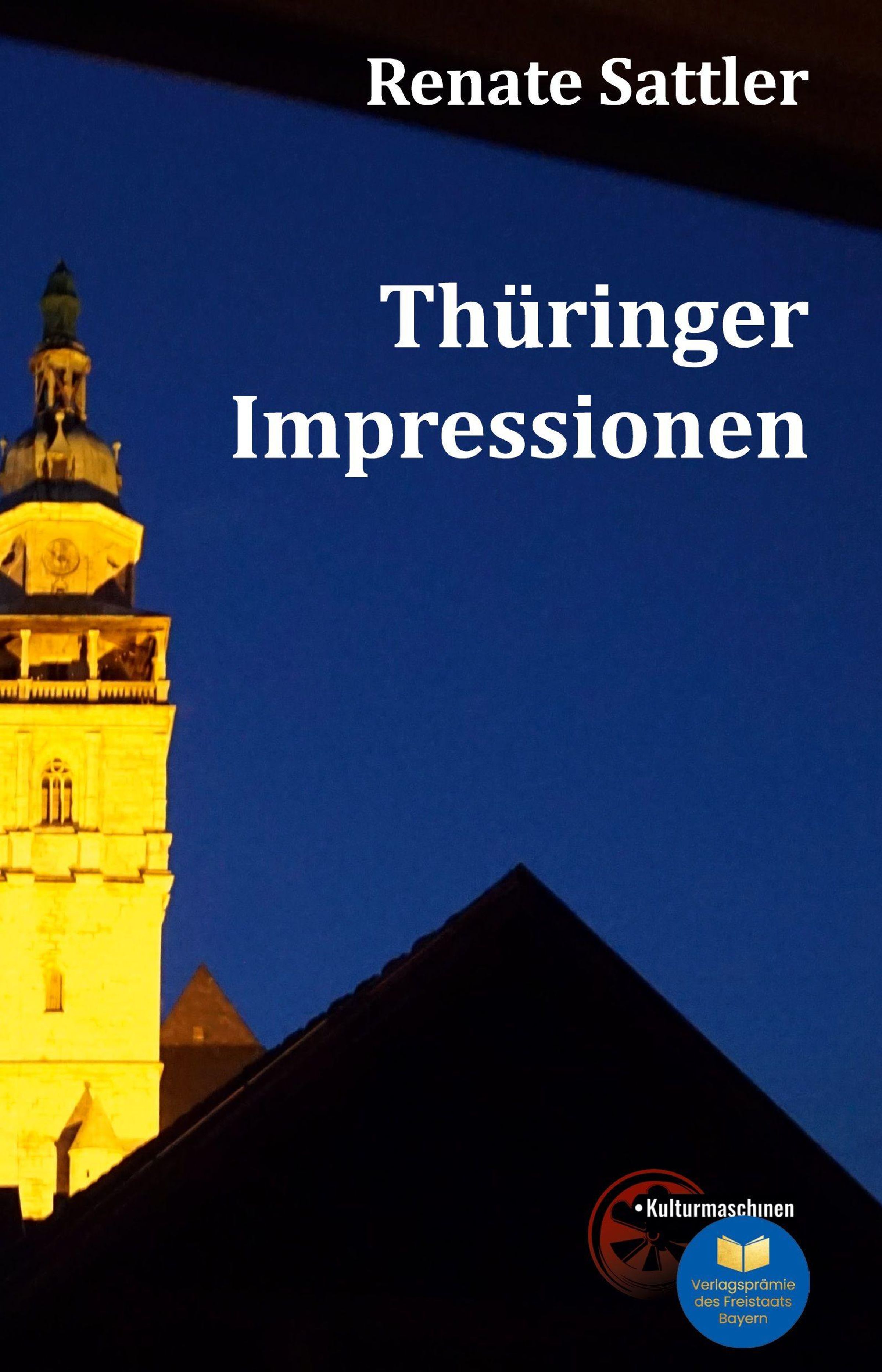 Text: Renate Sattler, Thüringer Impressionen. Ansicht eines beleuchteten Turms vor abendlichem Himmel mit Logo in der Ecke., Buch