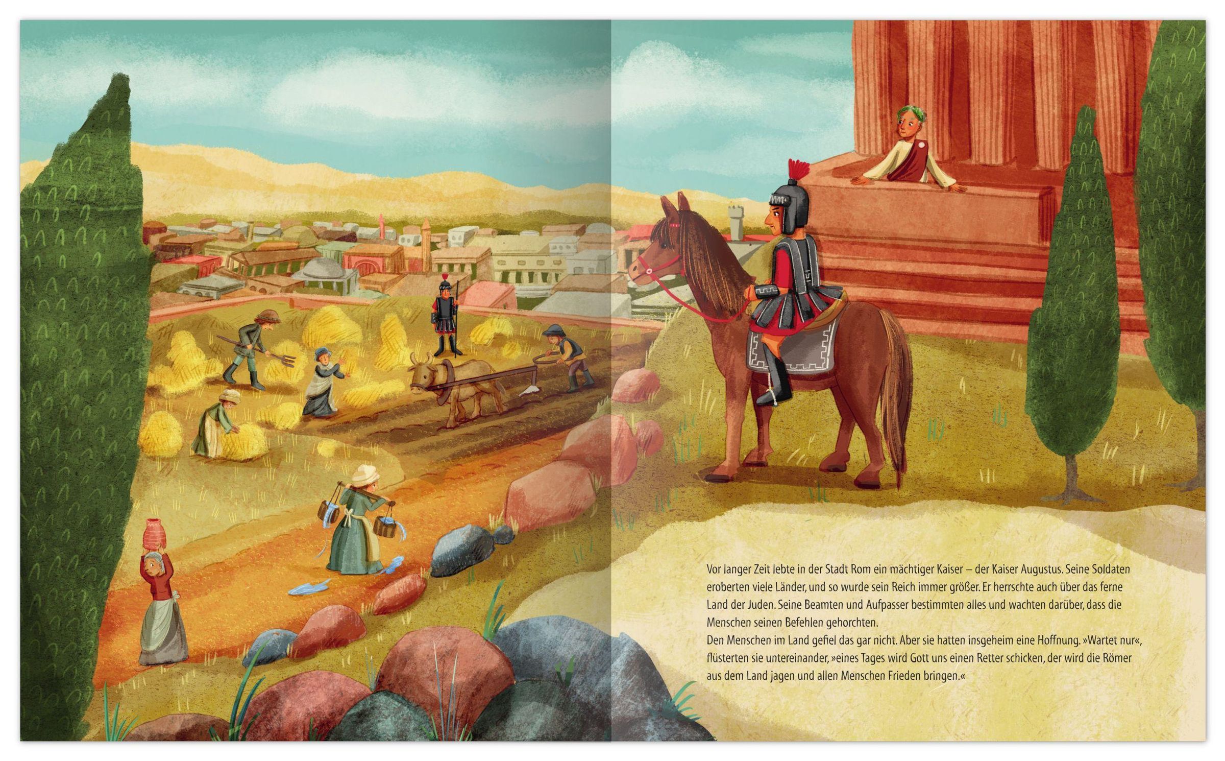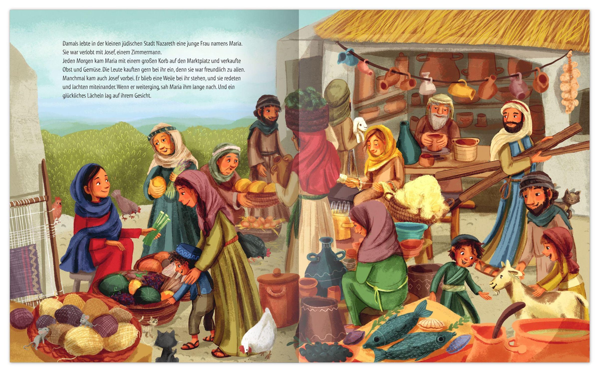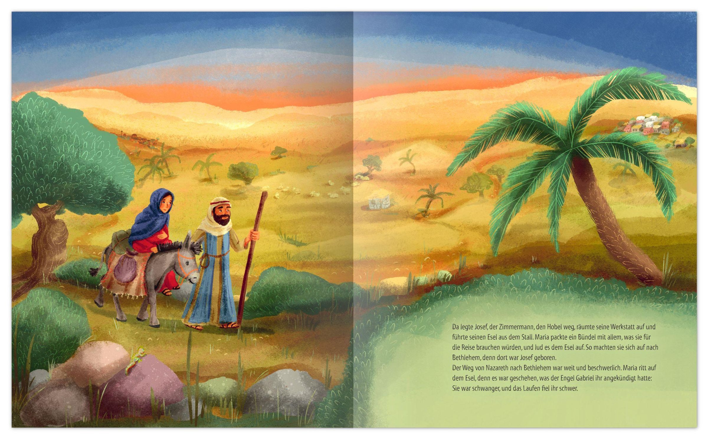 "Maria packte ein Bündel mit allem, was sie für die Reise brauchen würden, und lud es dem Esel auf. So machten sie sich auf nach Bethlehem, denn dort war Josef geboren."