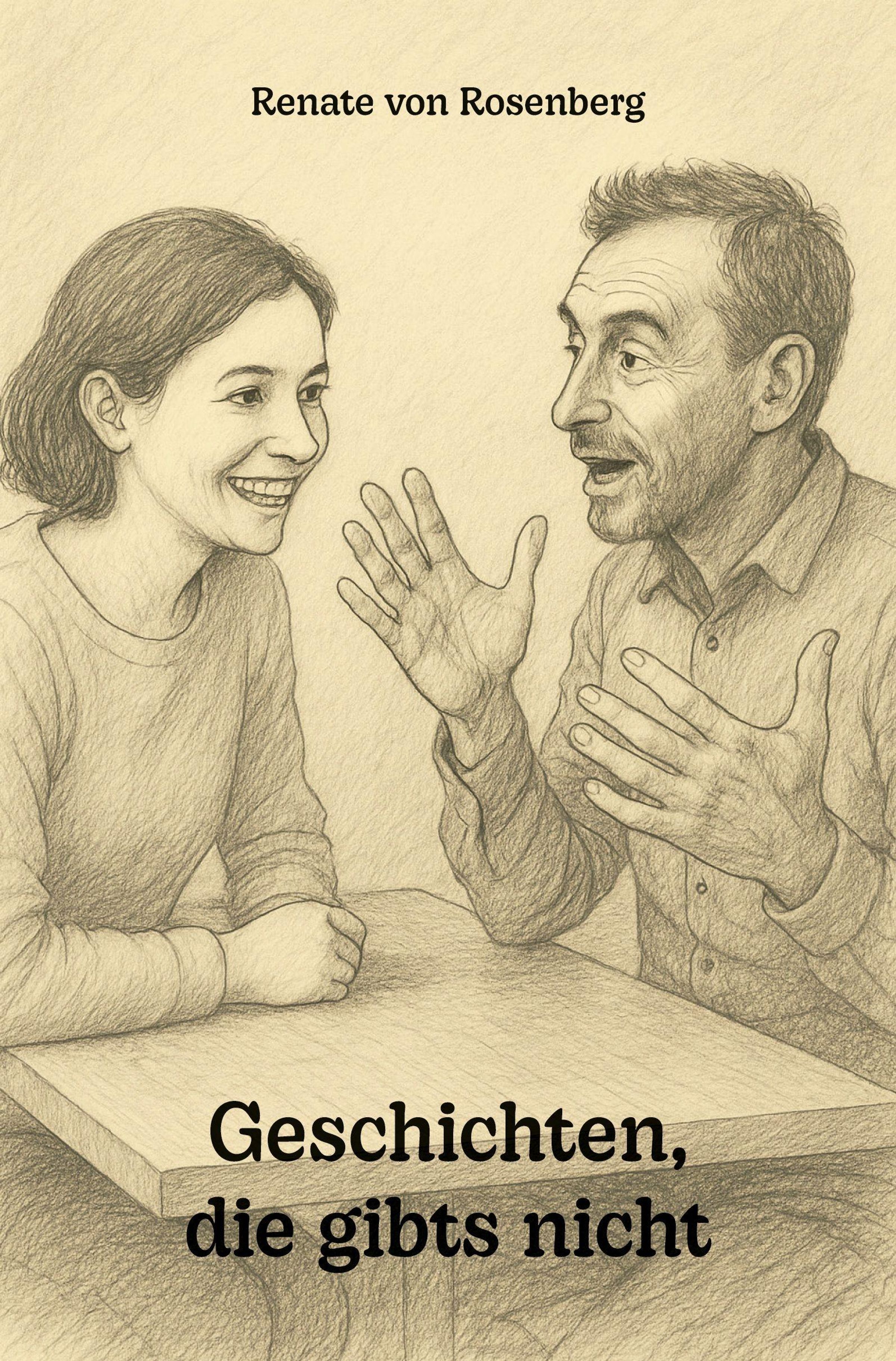 "Renate von Rosenberg", "Geschichten, die gibts nicht"; Zeichnung von Frau und Mann am Tisch, lebhaft im Gespräch., Buch
