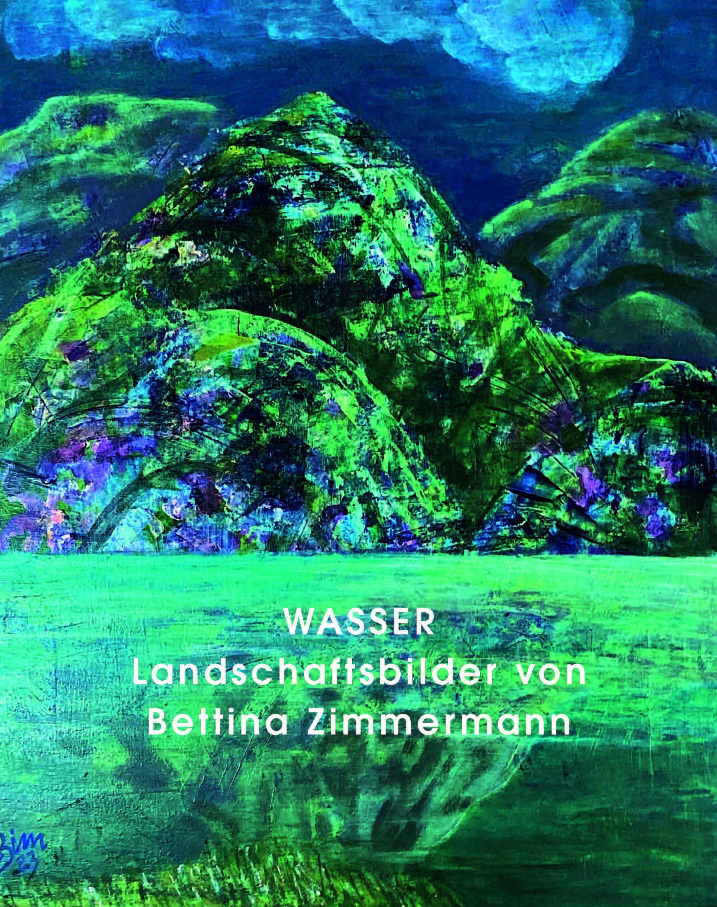 Text: "WASSER Landschaftsbilder von Bettina Zimmermann". Illustration mit grünen Hügeln und blauem Himmel im Hintergrund., Buch