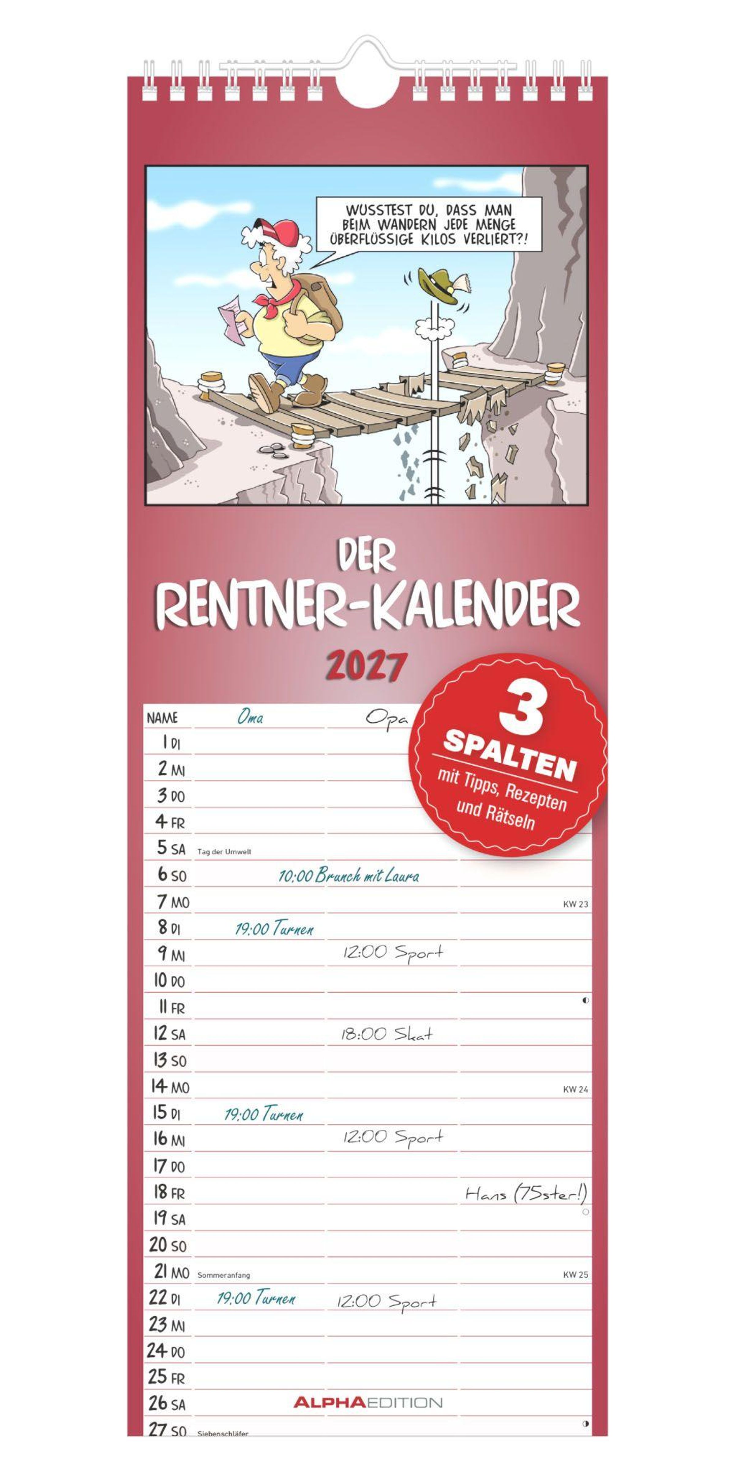 Der Alpha Edition Rentnerkalender 2027 ist der ideale Wandkalender für alle, die Termine im Blick behalten und dabei jeden Monat mit einem Schmunzeln genießen möchten.