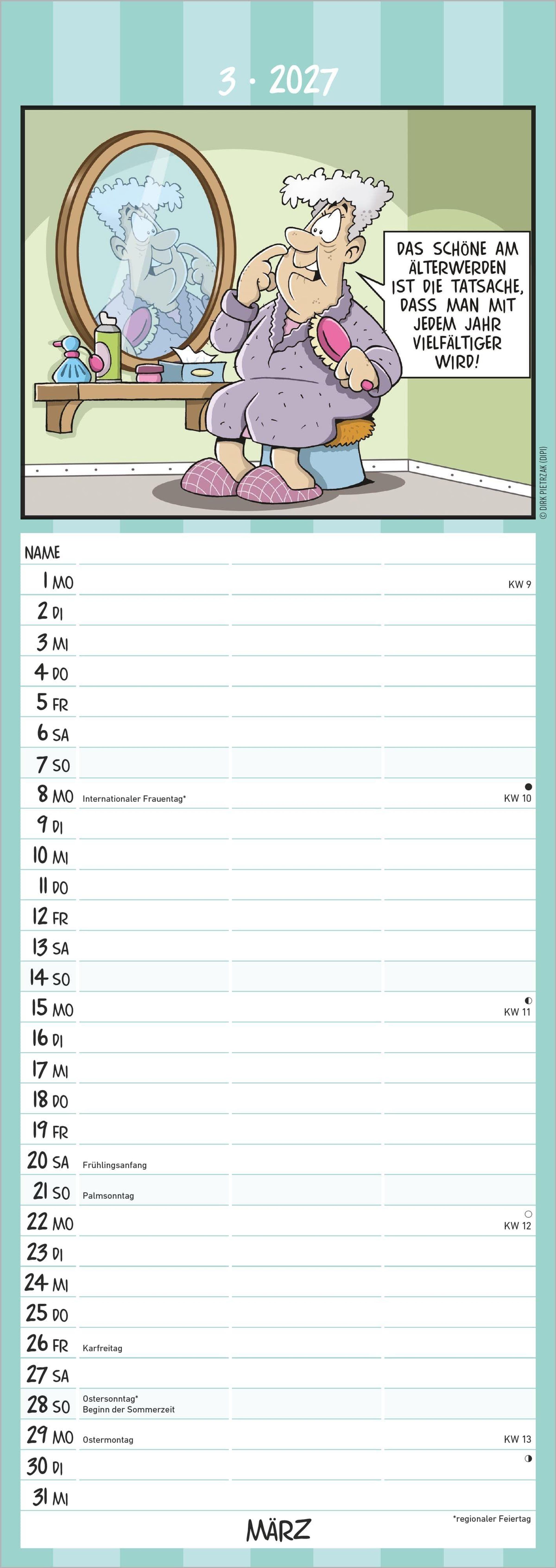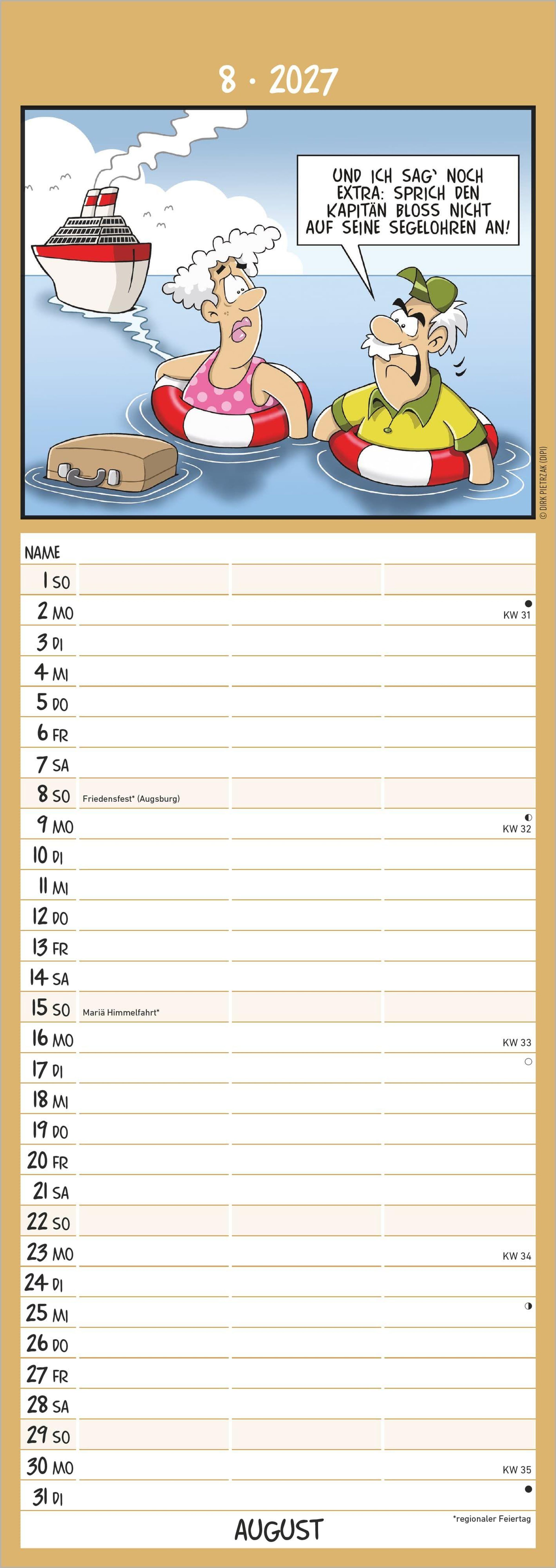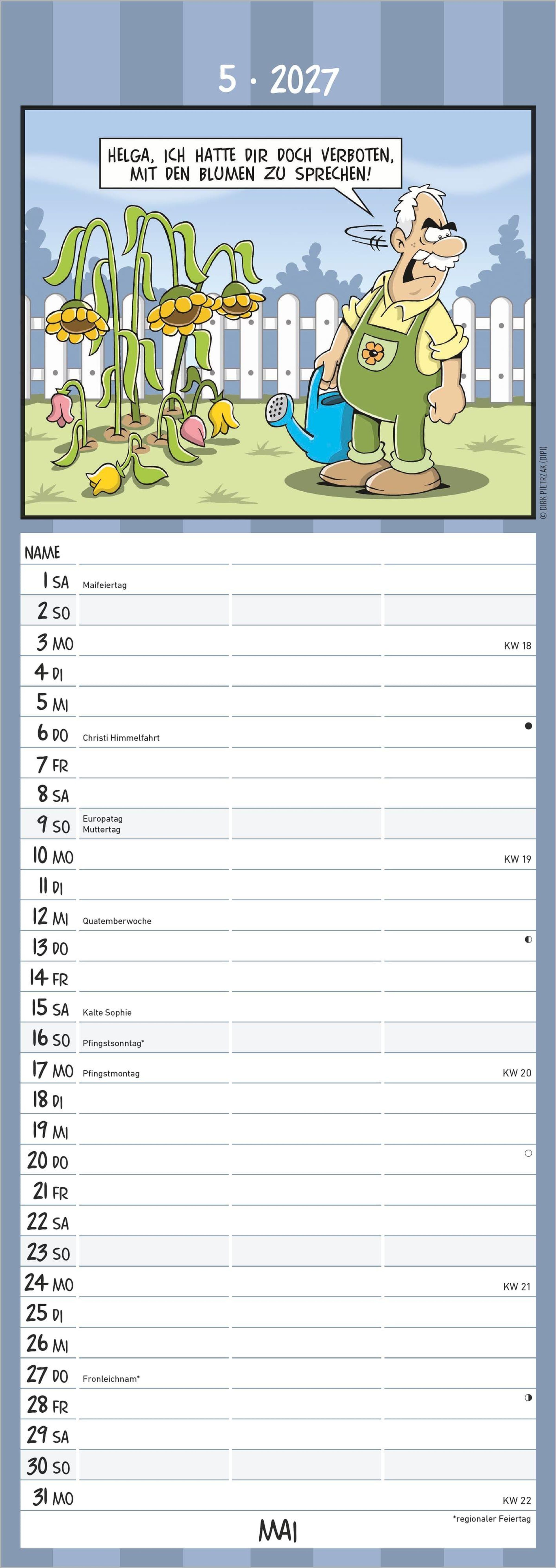 Der Alpha Edition Rentnerkalender 2027 bringt Humor und Organisation in den Alltag. Mit witzigen Cartoons von Dirk Pietrzak, drei übersichtlichen Spalten und vielen Zusatzinformationen ist dieser Streifenkalender ein praktischer und unterhaltsamer Begleiter durchs Jahr.