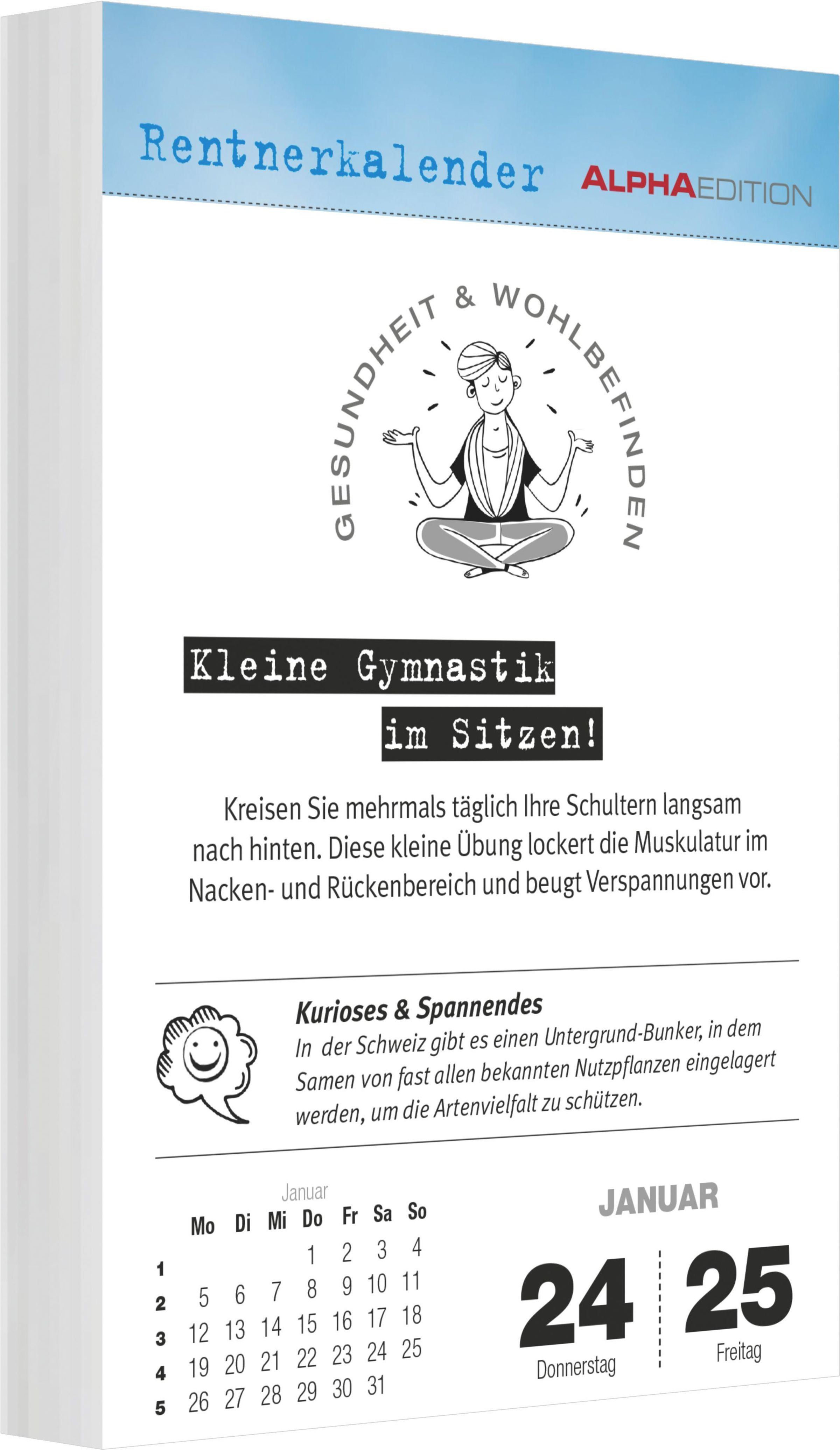 Der Alpha Edition „Rentnerkalender 2027" ist der ideale Begleiter für den Ruhestand -- informativ, unterhaltsam und perfekt für den Alltag zu Hause. Alle zwei Tage wartet eine neue Portion Wissen, Tipps und Inspiration: von Gesundheit & Wohlbefinden über Gedächtnis & Geist, Garten & Natur bis hin zu Ernährung & Rezepten. Für extra Unterhaltung sorgen zusätzlich unnütze Wissensfakten oder eine kleine Worträtsel-Frage. Dank Aufstellfunktion hat man den Kalender immer im Blick -- und als Geschenk ist er ideal für alle, die gerade frisch in Rente gegangen sind.