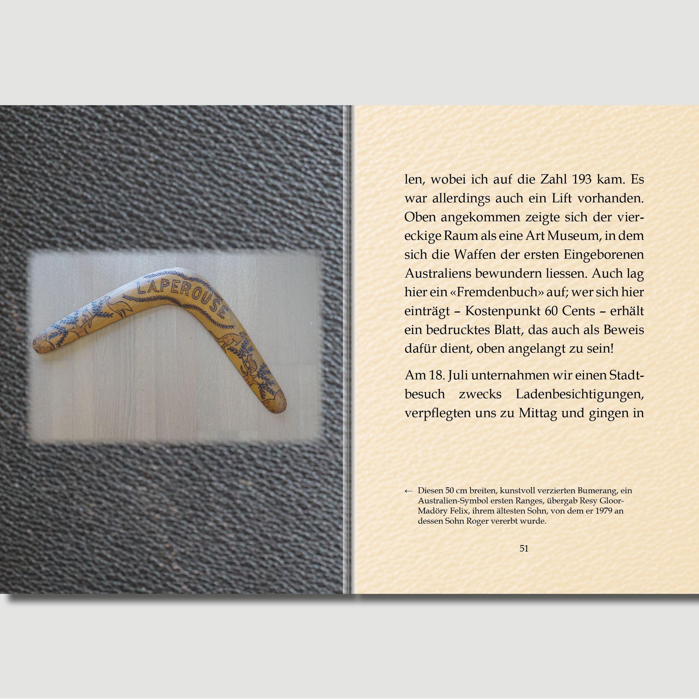 Da bieten sich die Schilderungen der Erlebnisse und Erfahrungen einer allein reisenden fünffachen Mutter vor gut 90 Jahren als Kontrast zur heutigen Perfekt-Touristik an. Jeweils 32 Tage war die Autorin nach Australien hin und zurück unterwegs. Ihre Schilderungen werden mit zeitgenössischen Illustrationen unterlegt.