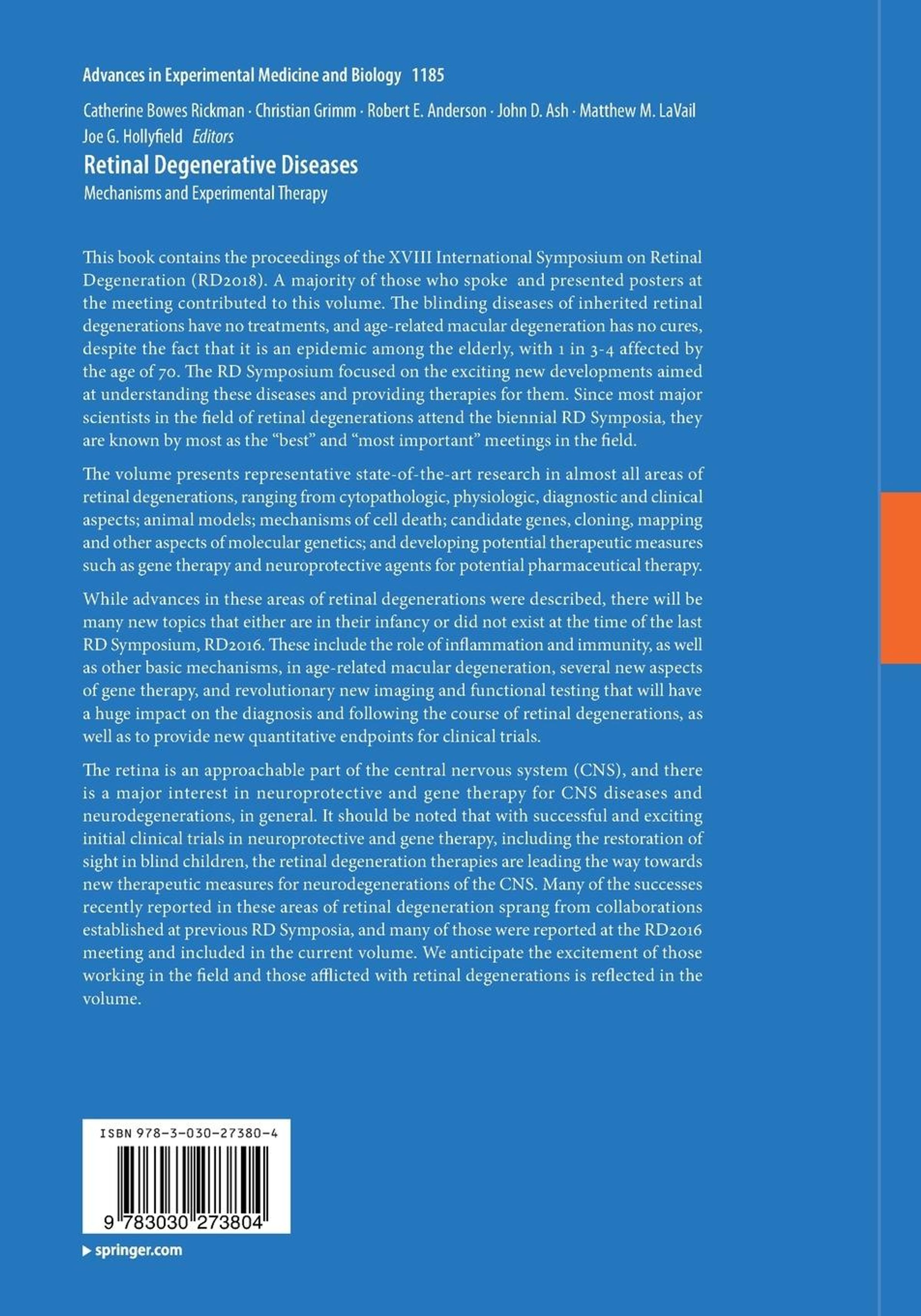 This book contains the proceedings of the XVIII International Symposium on Retinal Degeneration (RD2018). A majority of those who spoke and presented posters at the meeting contributed to this volume. The blinding diseases of inherited retinal degenerations have no treatments, and age-related macular degeneration has no cures, despite the fact that it is an epidemic among the elderly, with 1 in 3-4 affected by the age of 70. The RD Symposium focused on the exciting new developments aimed at understanding these diseases and providing therapies for them. Since most major scientists in the field of retinal degenerations attend the biennial RD Symposia, they are known by most as the "best" and "most important" meetings in the field.