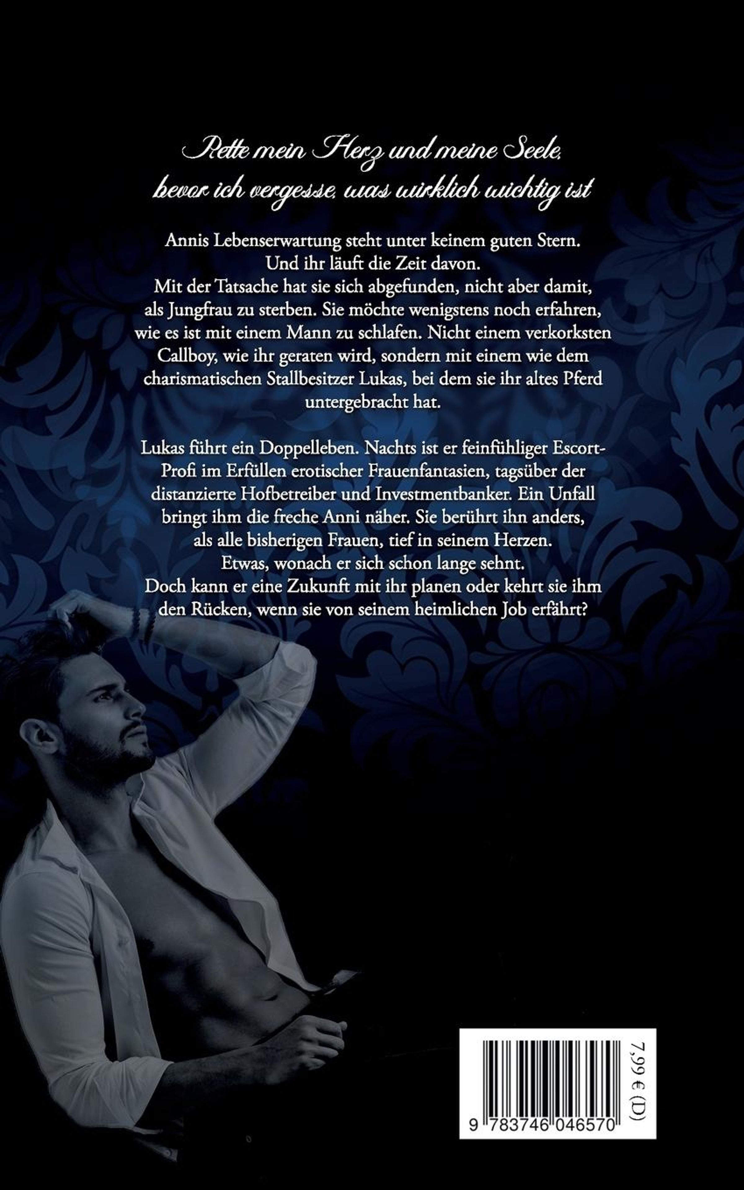 Lukas führt ein Doppelleben. Nachts ist er feinfühliger Escort-Profi im Erfüllen erotischer Frauenfantasien, tagsüber der distanzierte Hofbetreiber und Investmentbanker. Ein Unfall bringt ihm die freche Anni näher. Sie berührt ihn anders als alle bisherigen Frauen, tief in seinem Herzen. Etwas, wonach er sich schon lange sehnt. Doch kann er eine Zukunft mit ihr planen oder kehrt sie ihm den Rücken, wenn sie von seinem heimlichen Job erfährt? Viele Geheimnisse und Hürden stellen sich der Liebe eines reservierten Investmentbankers und einer naiven Frau mit Galgenhumor in den Weg. Annis Jungfräulichkeit und das Doppelleben von Lukas sind nur zwei davon.