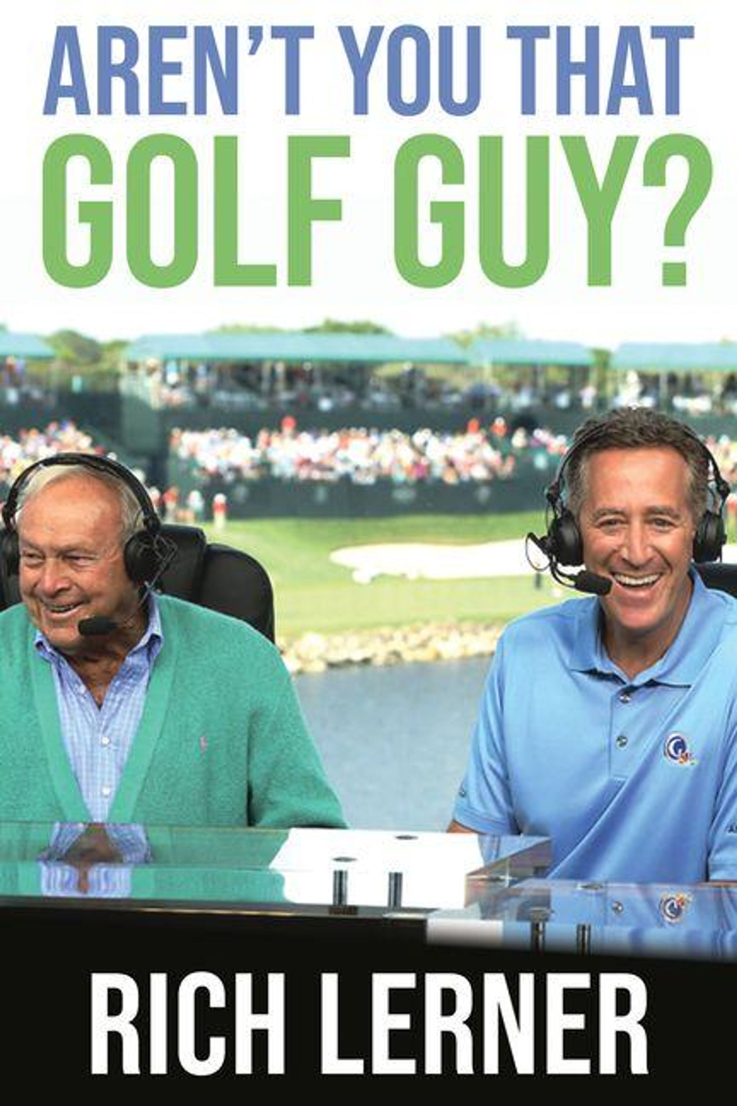 Text: "AREN'T YOU THAT GOLF GUY? RICH LERNER." Zwei Männer mit Headsets lachen, sitzen an einem Golfplatz., Buch