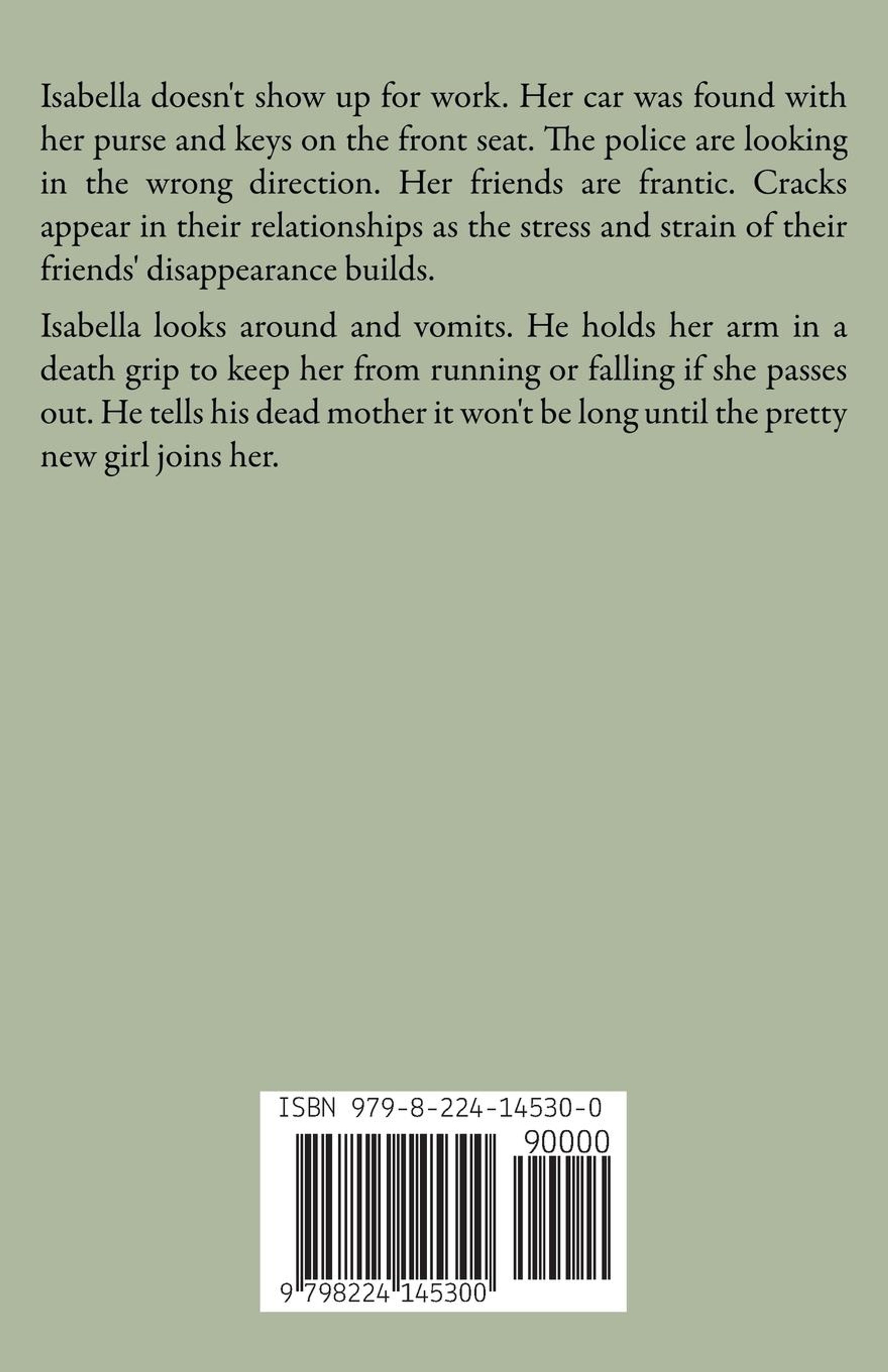 Isabella doesn't show up for work. Her car was found with her purse and keys on the front seat. The police are looking in the wrong direction. Her friends are frantic. Cracks appear in their relationships as the stress and strain of their friends' disappearance builds. Isabella looks around and vomits. He holds her arm in a death grip to keep her from running or falling if she passes out. He tells his dead mother it won't be long until the pretty new girl joins her.