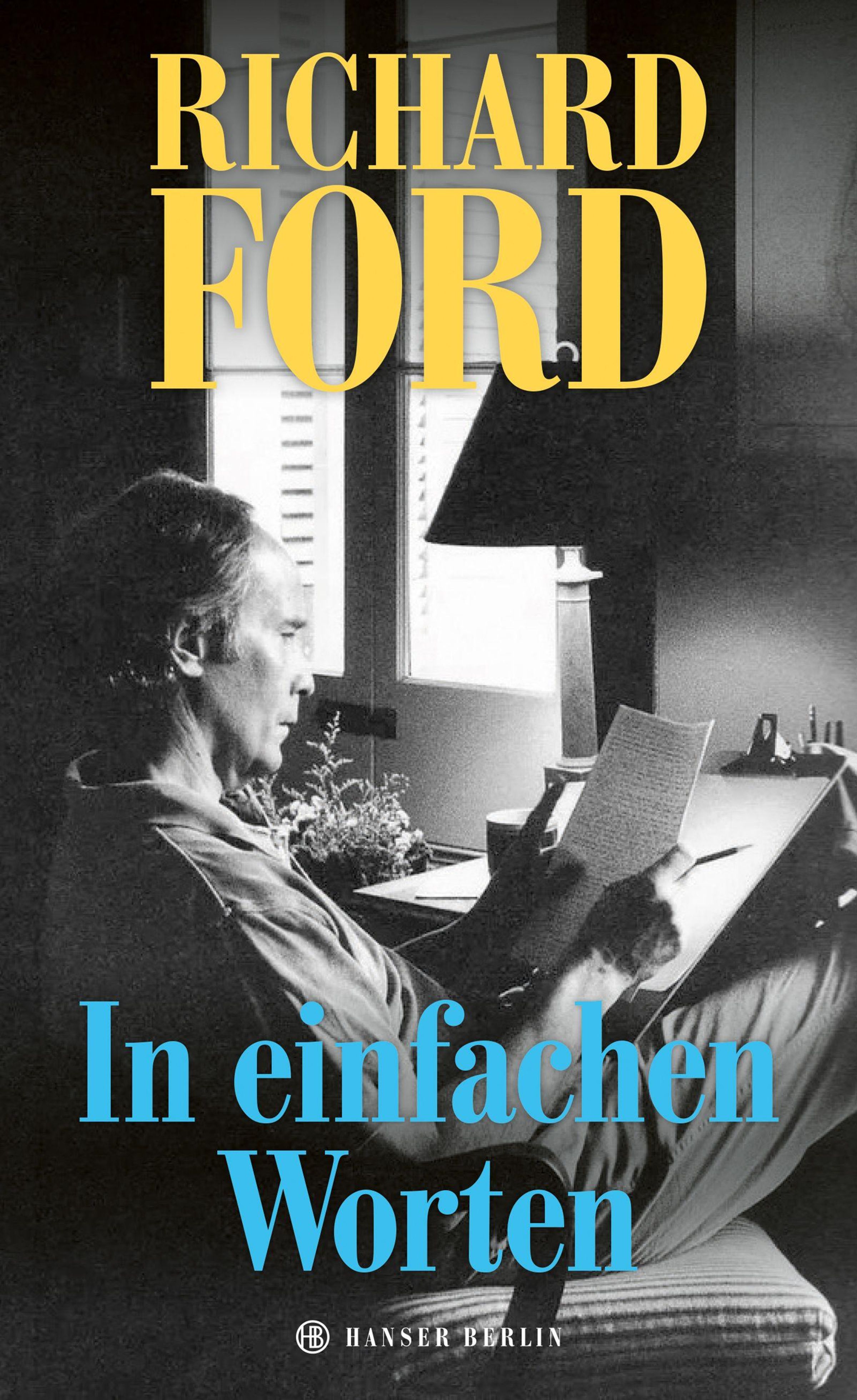 Text: "Richard Ford, In einfachen Worten, Hanser Berlin." Ein Mann schreibt an einem Schreibtisch, Pflanzen im Hintergrund., Buch