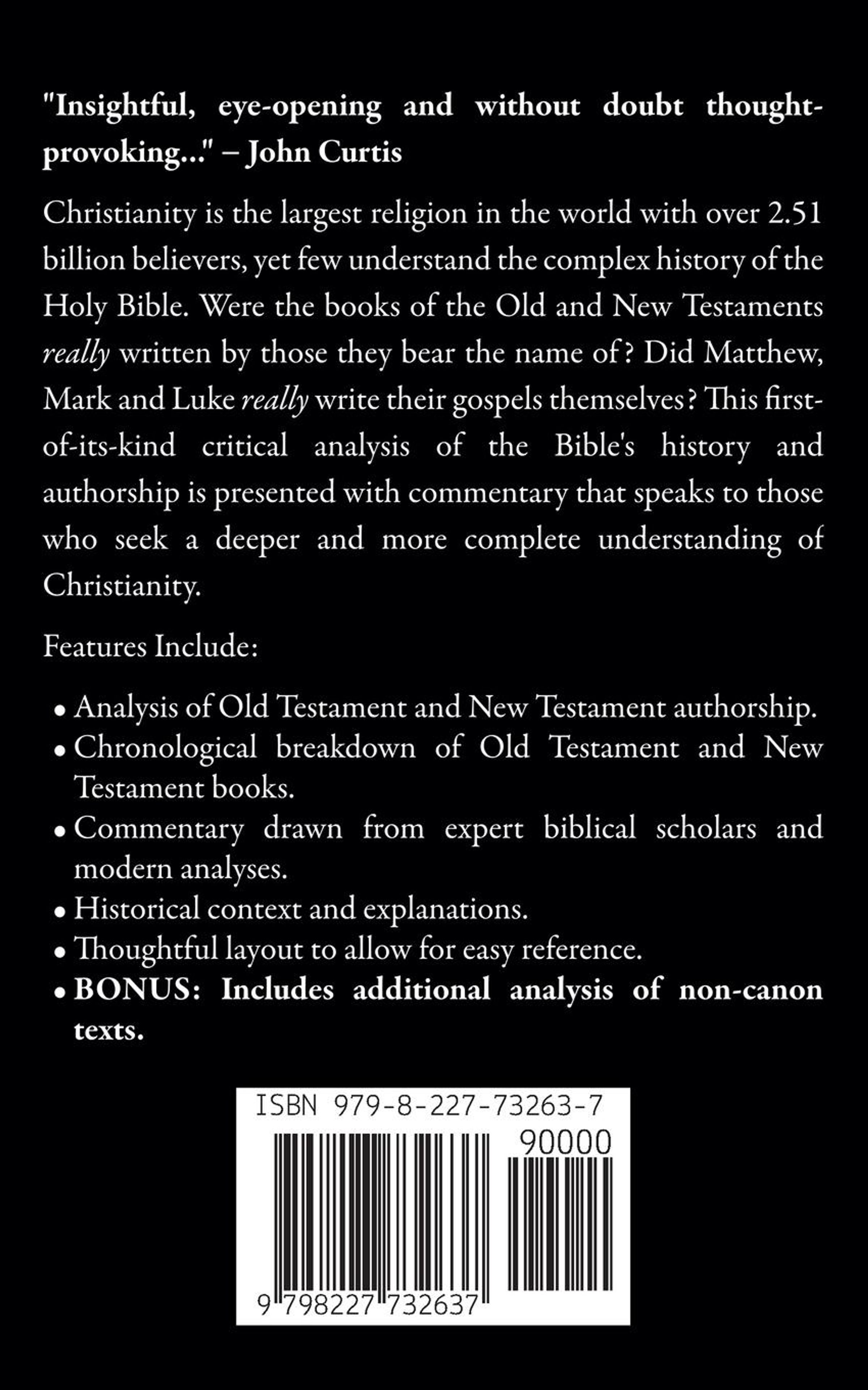 "Insightful, eye-opening and without doubt thought-provoking..." ¿ John Curtis Christianity is the largest religion in the world with over 2.51 billion believers, yet few understand the complex history of the Holy Bible. Were the books of the Old and New Testaments really written by those they bear the name of? Did Matthew, Mark and Luke really write their gospels themselves? This first-of-its-kind critical analysis of the Bible's history and authorship is presented with commentary that speaks to those who seek a deeper and more complete understanding of Christianity. Features Include: Analysis of Old Testament and New Testament authorship. Chronological breakdown of Old Testament and New Testament books. Commentary drawn from expert biblical scholars and modern analyses. Historical context and explanations. Thoughtful layout to allow for easy reference. BONUS: Includes additional analysis of non-canon texts.