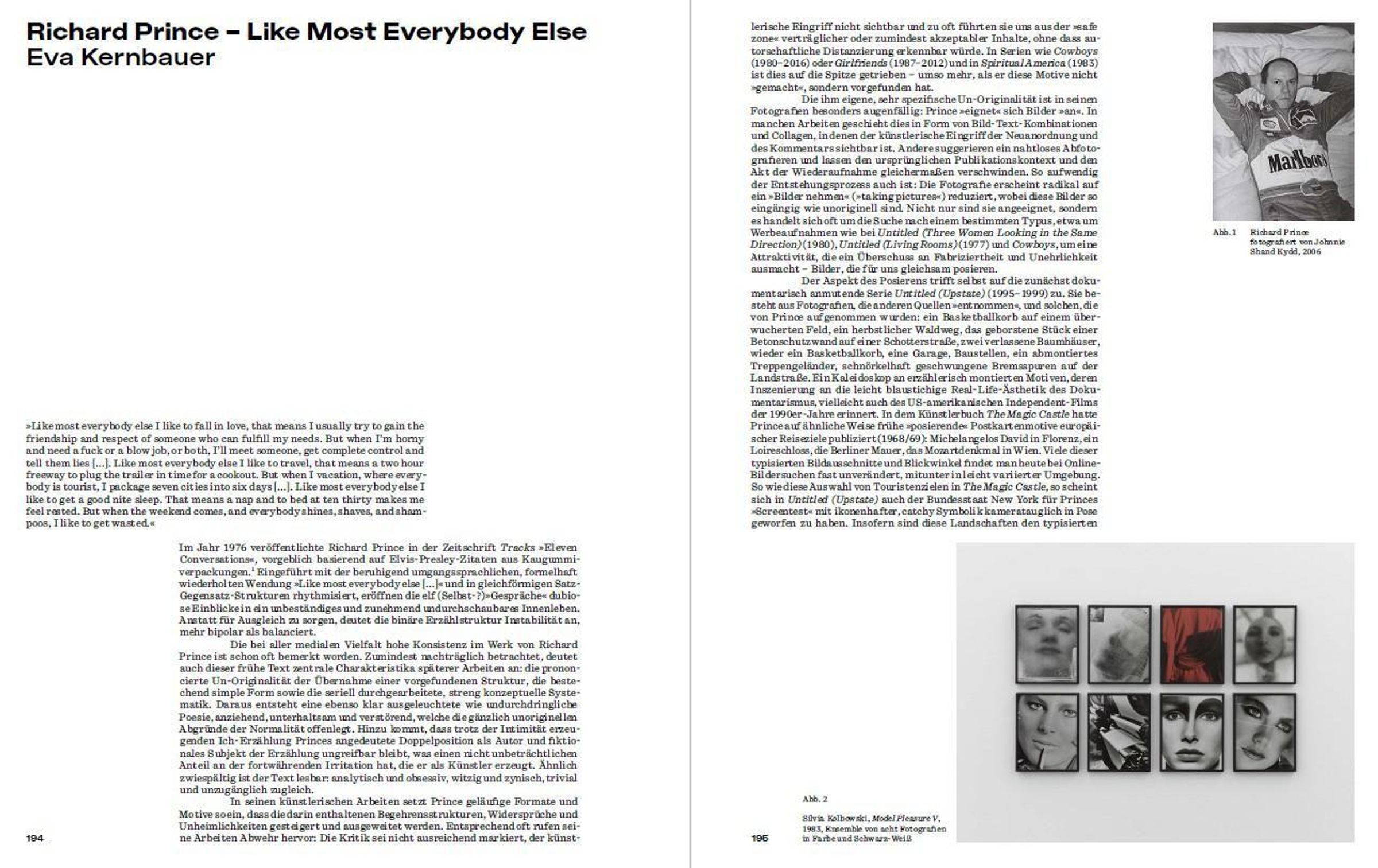 Richard Prince (*1949) zählt zu den bekanntesten Künstlern der Gegenwart. Mit seinen Aneignungen von Bildern aus der Werbeindustrie polarisiert der amerikanische Maler und Fotograf seit den 1970er-Jahren. Im Zentrum der Publikation steht sein fotografisches Werk, sie zeigt aber auch andere Medien wie Installationen, Zeichnungen und Malereien. Vereint werden ikonische Arbeiten von Richard Prince wie seine Reihen Cowboys oder Fashion mit selten oder bislang nicht veröffentlichten Werken.