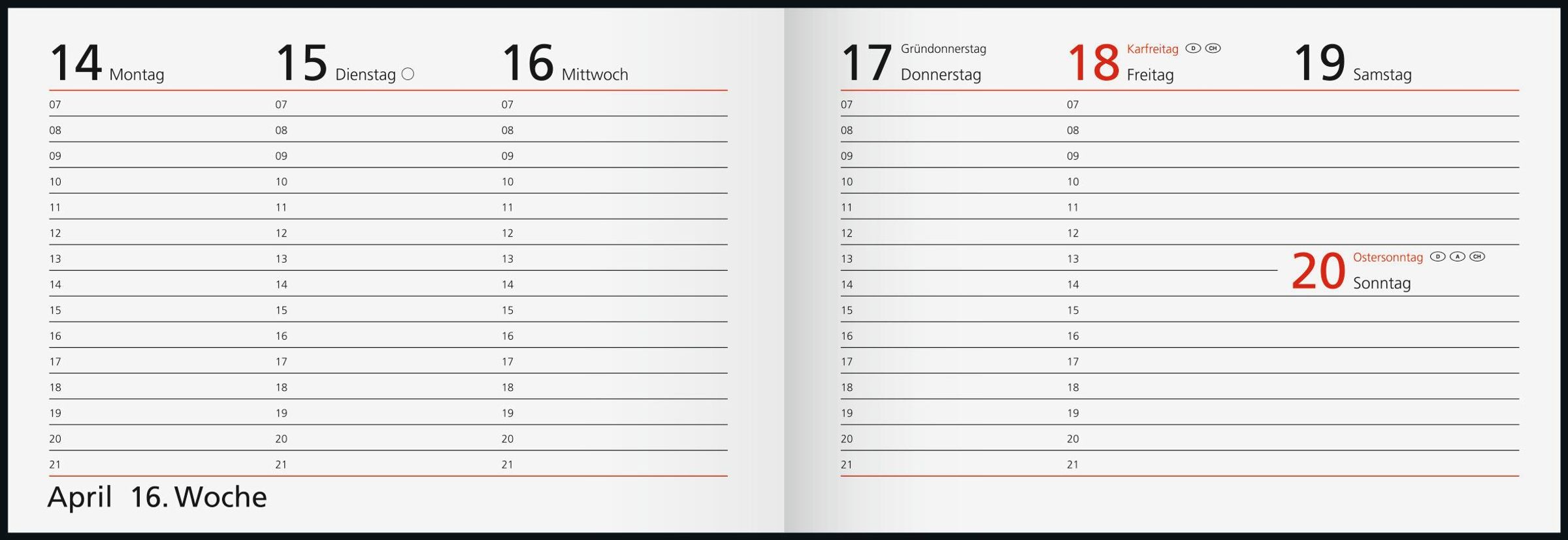 Blattgröße: 152 × 102 mm ? 2 Seiten = 1 Woche ? 128 Seiten, Druckfarbe Kalendarium: schwarz / rot ? 70 g / m², Klebebindung ? Kunststoff-Einband Reflection, Farbe: blau ? Jahresübersicht aktuelles Jahr und Folgejahr, 6 Seiten Monatsplan Folgejahr, Ferientermine Deutschland, 10 Seiten Wissenswertes, auswechselbares Adressheft, 16 Seiten ? Stundeneinteilung von 7-21 Uhr, nicht Sa. und So. ? Zeichenband ? für Kalenderjahr 2026