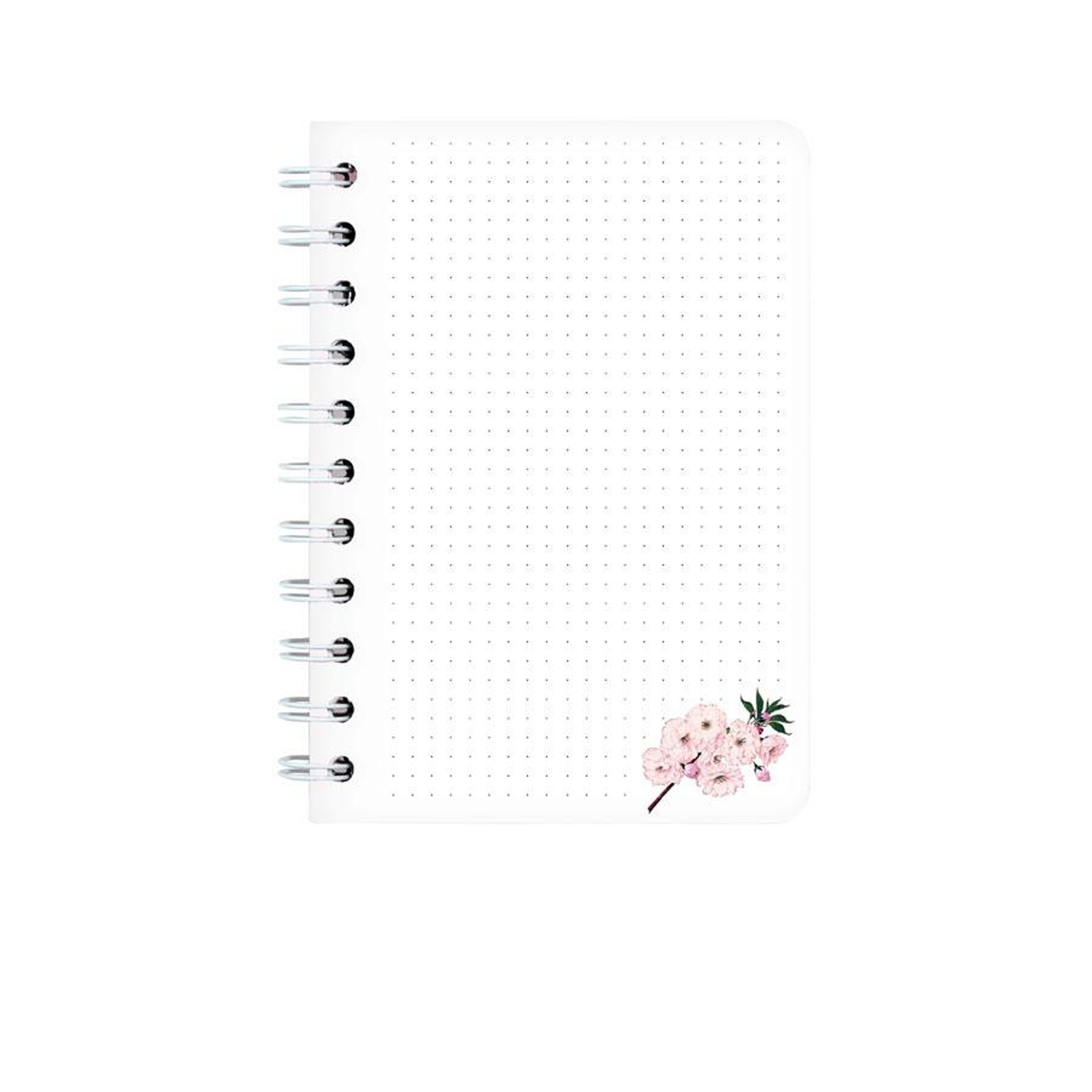 Notizbuch mit Ringbindung im Format A6 mit 100 Blatt punktkariertem 80 g / m² Papier. Das Cover hat abgerundete Ecken und ist samtweich laminiert, die Innenseiten sind farbig bedruckt und das Covermotiv ist auf einer Ecke der Innenseiten beidseitig in Farbe gedruckt.