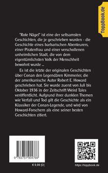 "Rote Nägel" ist eine der seltsamsten Geschichten, die je geschrieben wurden - die Geschichte eines barbarischen Abenteurers, einer Piratenfrau und einer verschollenen unheimlichen Stadt, die von dem eigentümlichsten Volk der Menschheit bewohnt wurde ... Es ist die letzte der originalen Geschichten über Conan den Legendären Kimmerier, die der amerikanische Autor Robert E. Howard geschrieben hat. Sie wurde zuerst von Juli bis Oktober 1936 in der Zeitschrift Weird Tales veröffentlicht. Aufgrund ihrer dunklen Themen wie Verfall und Tod gilt die Geschichte als ein Klassiker der Conan-Legende, und wird von Howard-Forschern als eine seiner besten Geschichten zitiert.