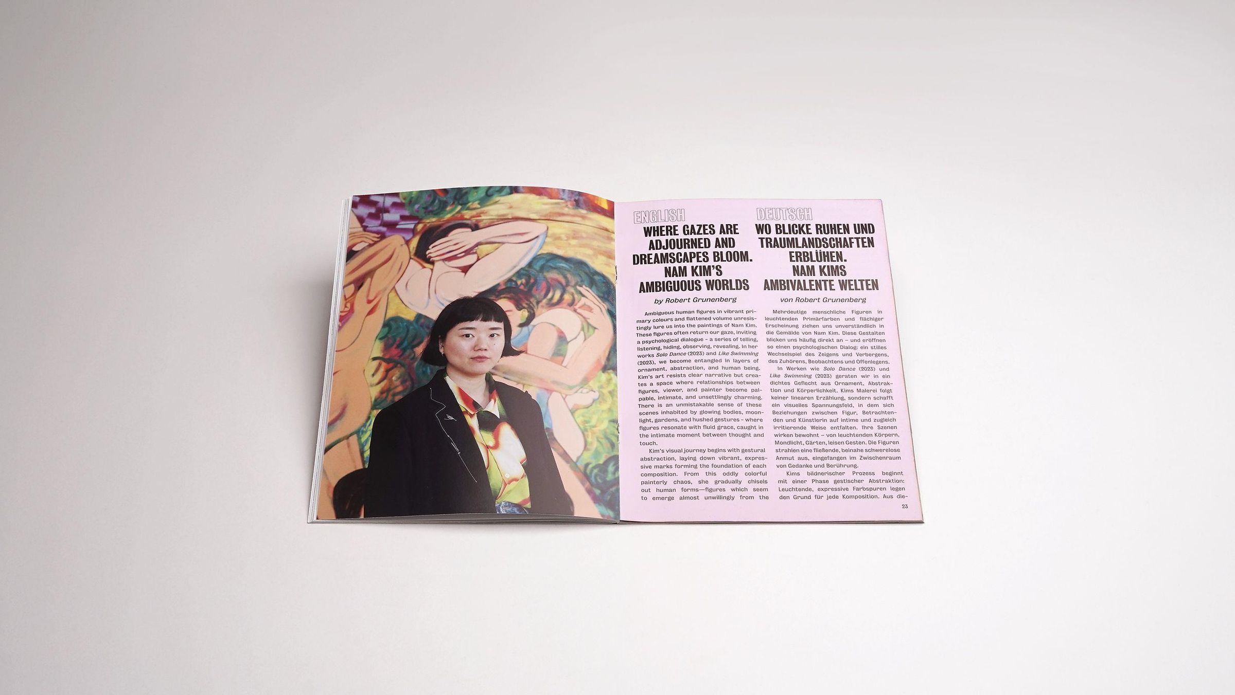 The large-format paintings of Nam Kim (born 1991 in the US, lives in Vienna) are inhabited by chunky androgynous, naked figures, which gently blend with the vegetation, light and shadows, or ornaments around them. "The figures resonate with fluid grace, caught in the intimate moment between thought and touch." (R. Grunenberg) Here, the human body is equal to its natural environs and not separate. Kim begins her paintings with zones of gestural abstraction, from which the characters grow like plants into her compositions. Kim grew up in Korea and her painting practice combines elements of Asian traditions (in art and theater) with Western art history and virtuality. This book presents her works of the last three years and includes an insightful essay by Robert Grunenberg.