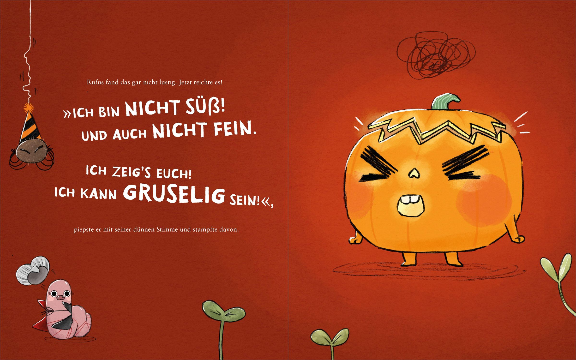 Rufus hat ein Problem: Halloween naht und der kleine Kürbis sieht einfach - oh Schreck - SÜSS aus! Er setzt alles daran, schrecklich gruselig zu werden. Mindestens so gruselig wie der kopflose Reiter! Doch alle seine Pläne klappen nicht. Kein Wunder, dass er langsam richtig sauer wird. Doch als er schon aufgeben will, läuft ihm der kopflose Reiter selbst über den Weg und die beiden beschließen, dass sie als Grusel-Duo die Welt gehörig in Schrecken versetzen können. Doppelt gruselt schließlich besser.