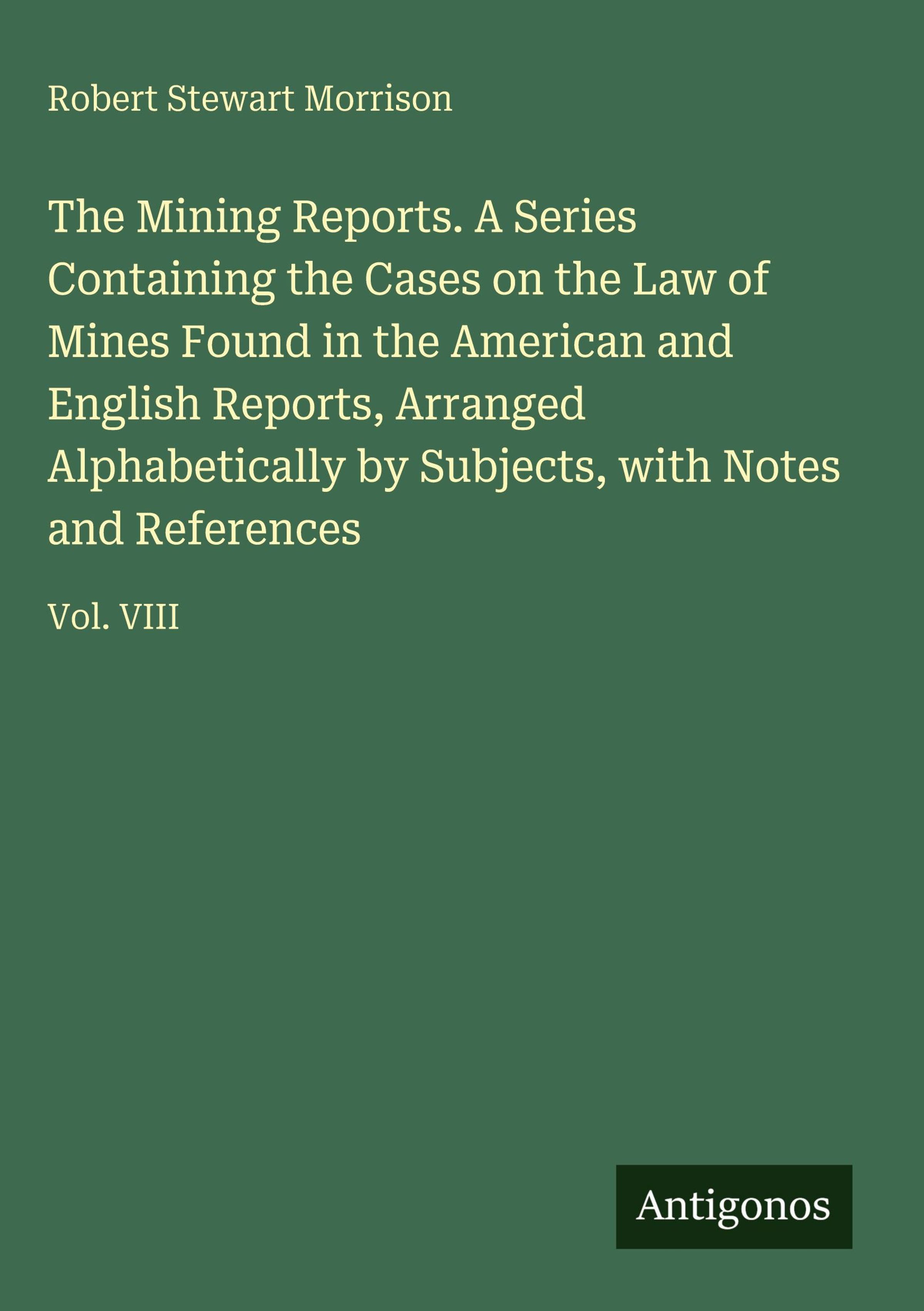 The Mining Reports. A Series Containing the Cases on the Law of Mines Found in the American and English Reports, Arranged Alphabetically by Subjects, with Notes and References