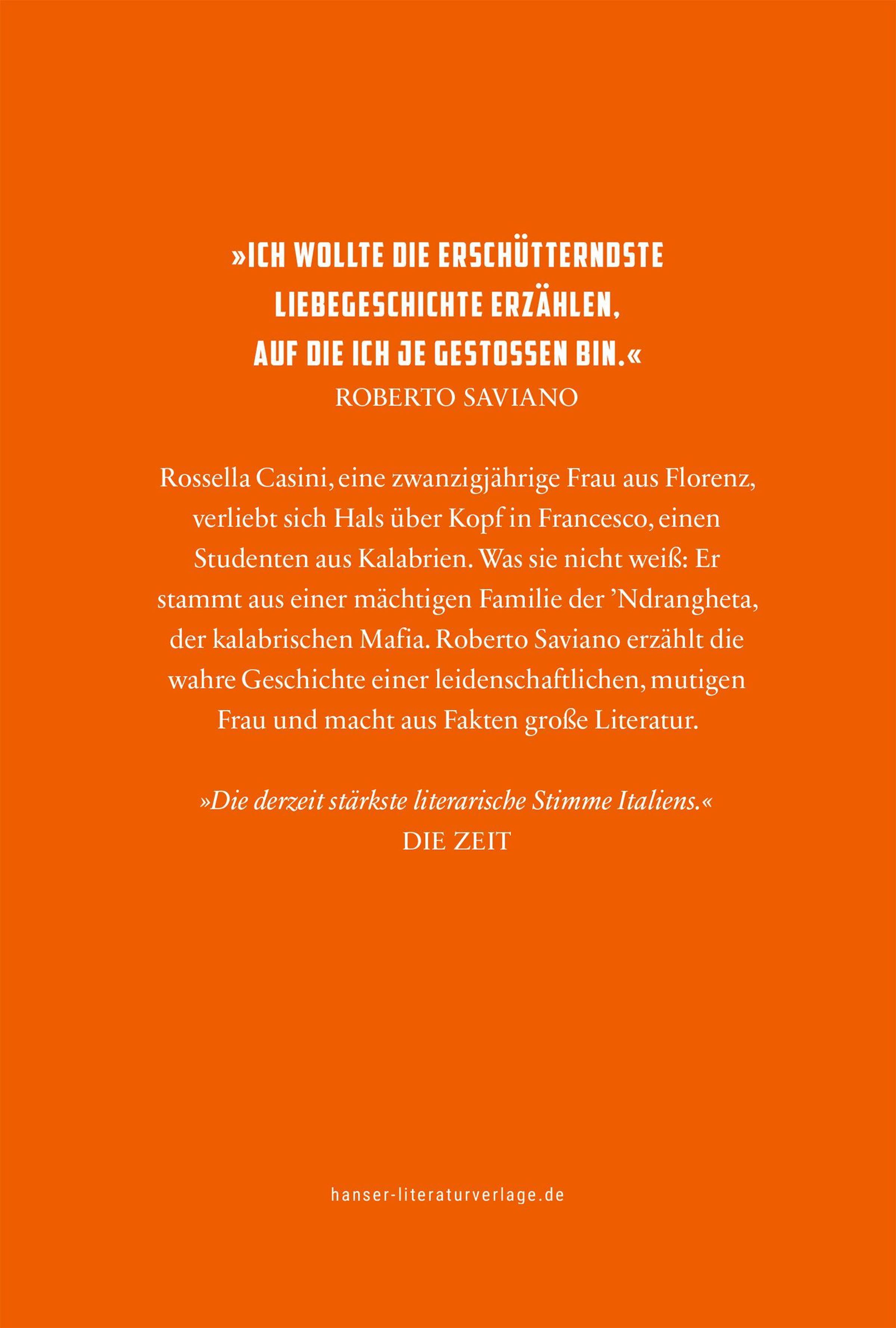 Rossella Casini, eine zwanzigjährige Frau aus Florenz, verliebt sich Hals über Kopf in Francesco, einen Studenten aus Kalabrien. Was sie nicht weiß: Er stammt aus einer mächtigen Familie der 'Ndrangheta. Als sie in sein Heimatdorf reist, bricht eine gewaltsame Familienfehde aus. Rossella flieht nicht, sie will kraft ihrer Liebe Francesco dort herausziehen. Doch auf einmal verschwindet sie spurlos. Nach dem Erfolg von 'Falcone' erzählt Roberto Saviano die wahre Geschichte einer leidenschaftlichen, mutigen Frau und macht erneut aus Fakten große Literatur.