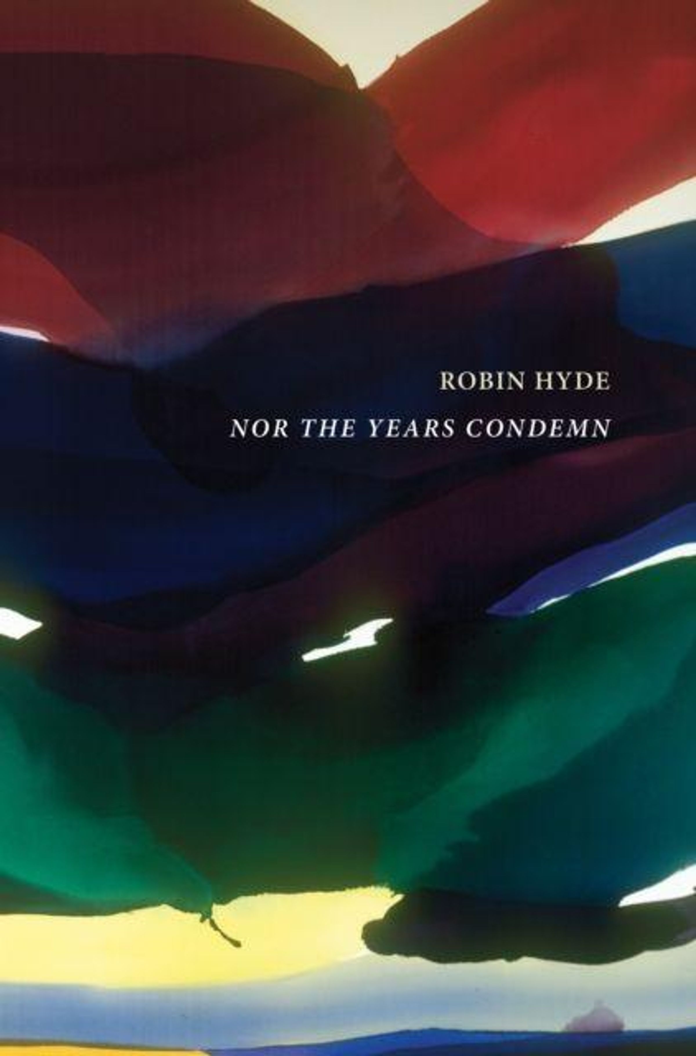 Text: "ROBIN HYDE NOR THE YEARS CONDEMN." Aquarellartige, abstrakte Farben in Rot, Blau, Grün und Gelb., Buch